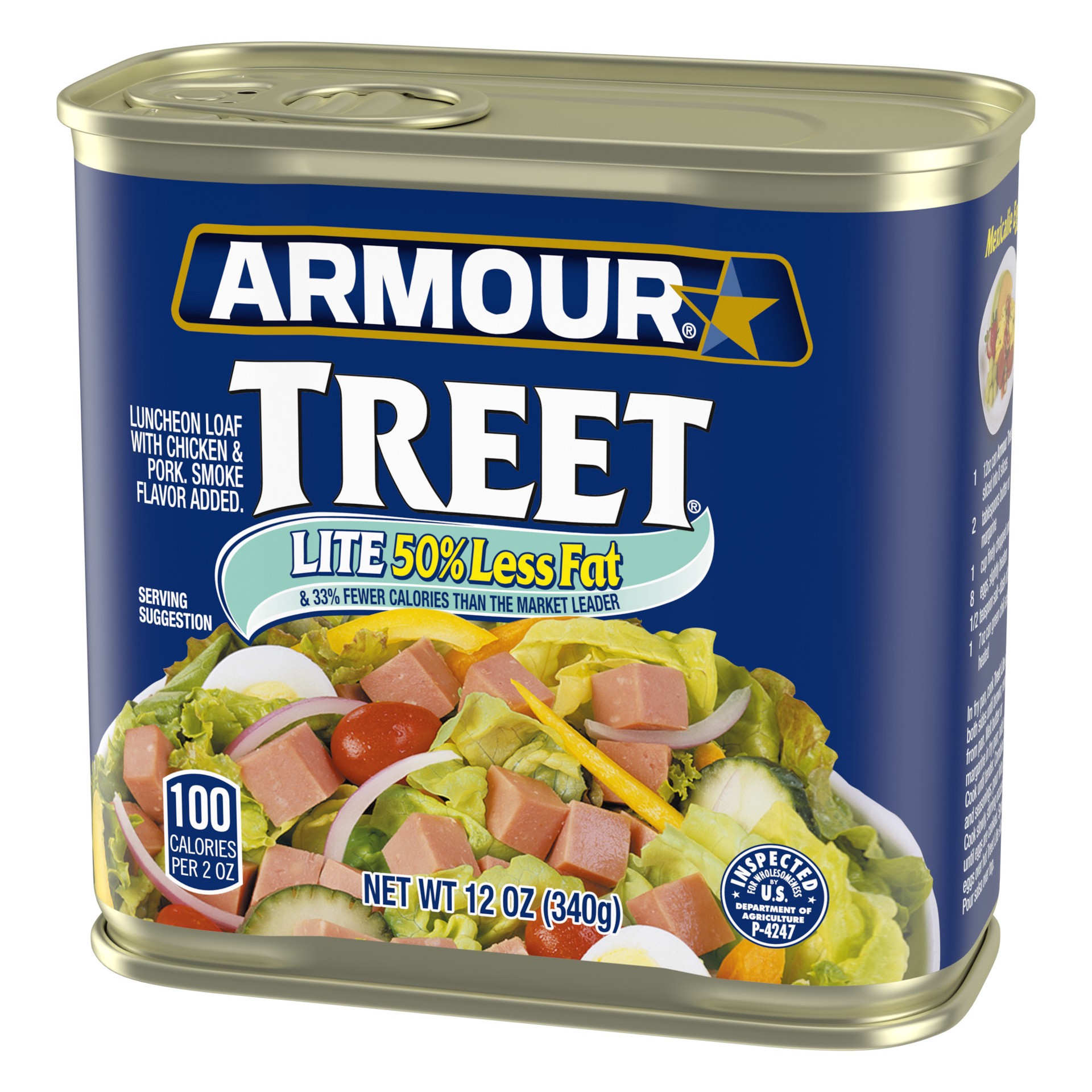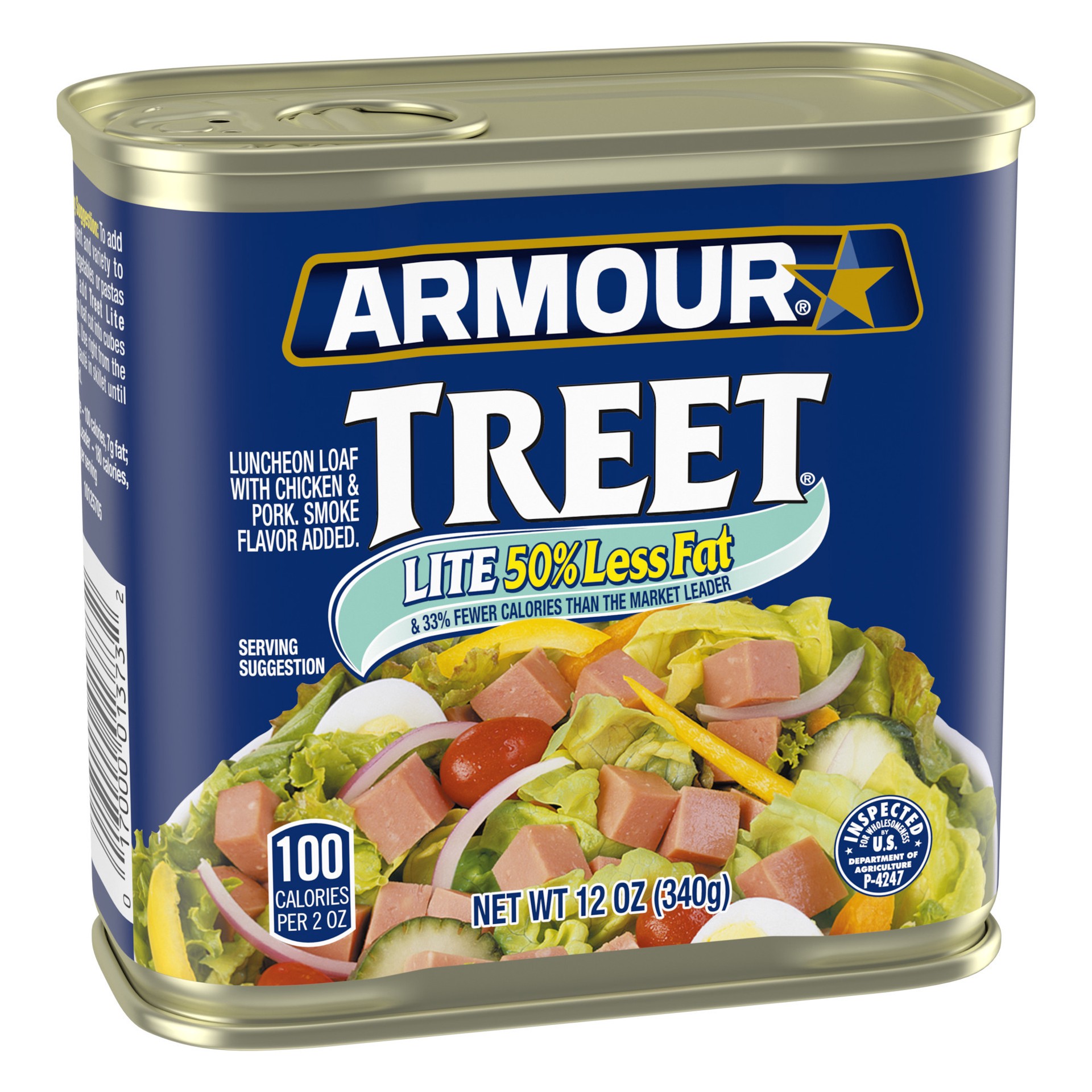 Smoke flavor added. 50% less fat & 33% fewer calories than the market leader. Inspected for wholesomeness by US Department of Agriculture. Treat Lite - 110 calories, 8 g fat; Market Leader - 180 calor…