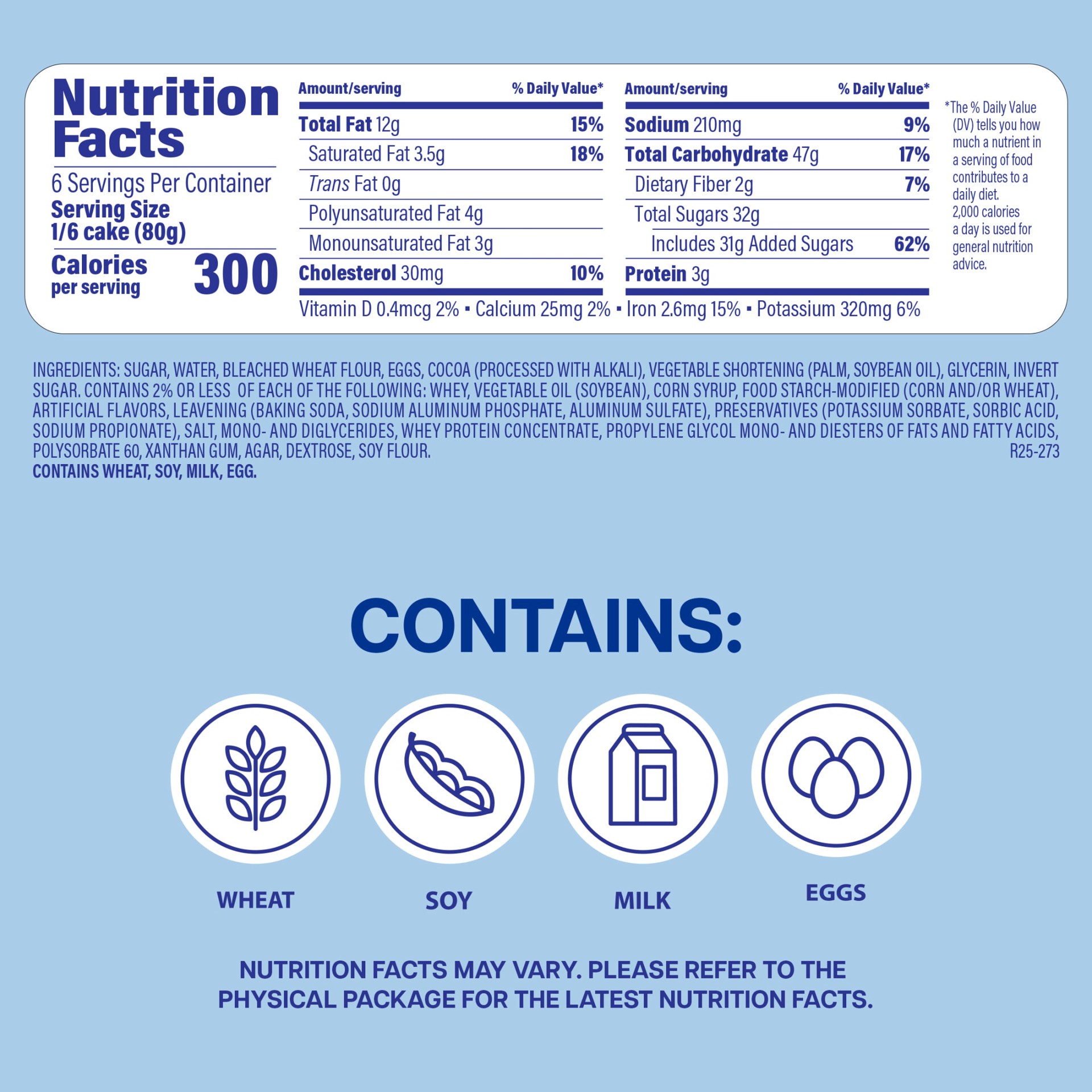 Sugar, Water, Bleached Wheat Flour, Eggs, Cocoa (Processed with Alkali), Vegetable Shortening (Palm, Soybean Oil), Glycerin, Invert Sugar. Contains 2% or Less of Each of the Following: Whey, Vegetable…