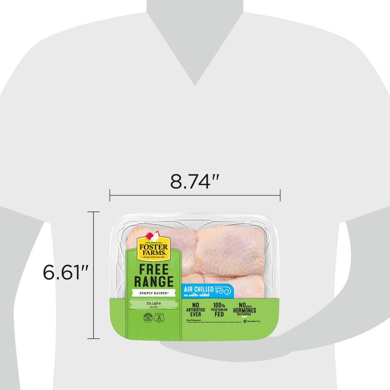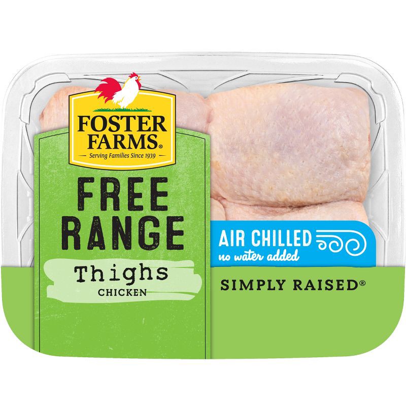 Foster Farms Free Range Simply Raised Chicken Thighs. Serving families since 1939. Free range, air chilled. No water added. No antibiotics ever. 100% vegetarian fed. No added hormones (federal regulat…