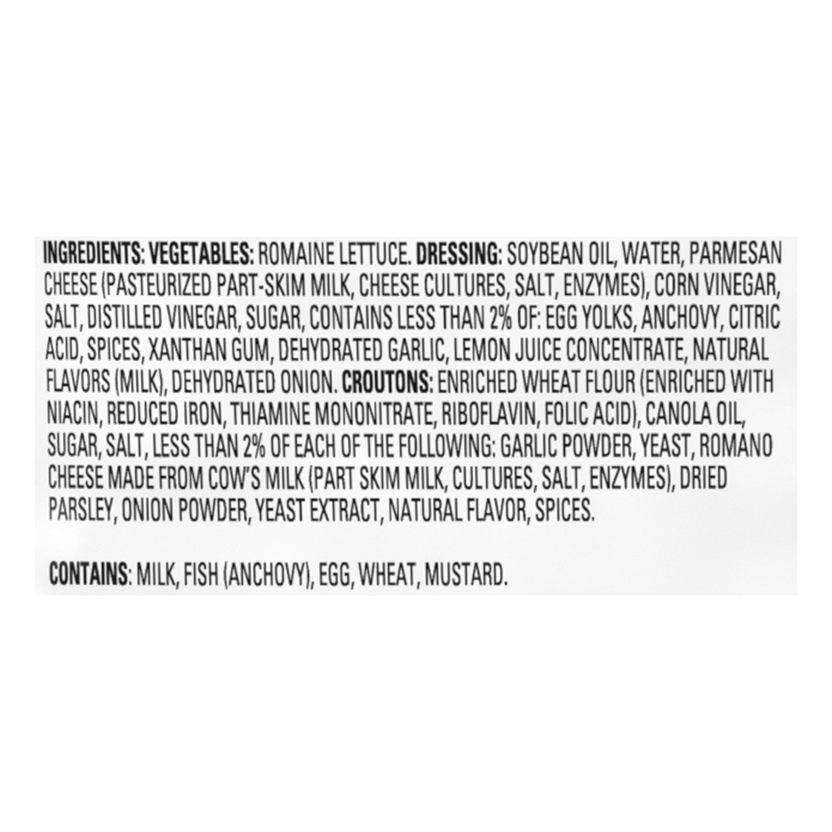 Vegetables: Romaine Lettuce. Dressing: Soybean Oil, Water, Parmesan Cheese (Pasteurized Part-Skim Milk, Cheese Cultures, Salt, Enzymes), Corn Vinegar, Salt, Distilled Vinegar, Sugar, Contains Less tha…