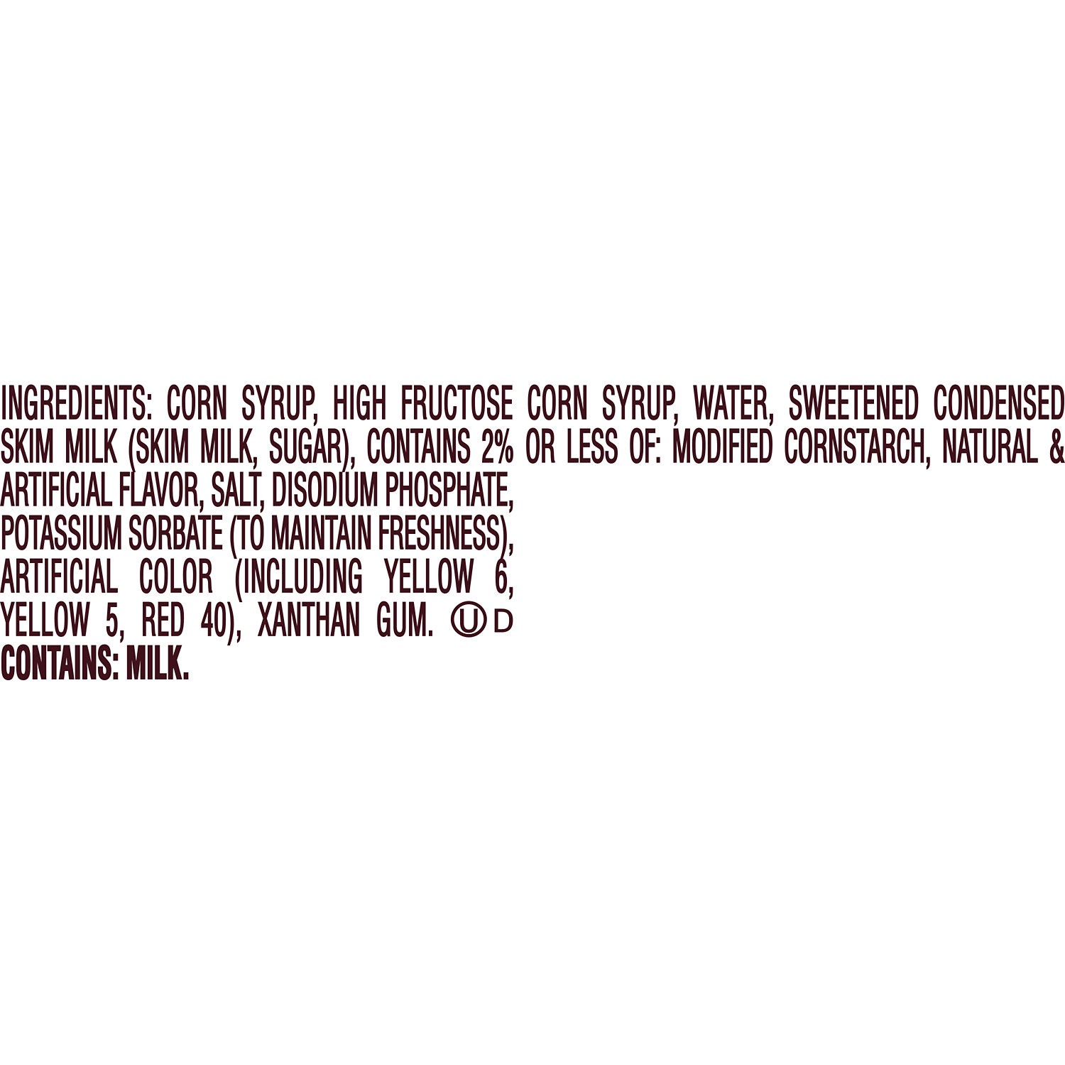 CORN SYRUP, HIGH FRUCTOSE CORN SYRUP, WATER, SWEETENED CONDENSED SKIM MILK (SKIM MILK, SUGAR), CONTAINS 2% OR LESS OF: MODIFIED CORNSTARCH, NATURAL & ARTIFICIAL FLAVOR, SALT, DISODIUM PHOSPHATE, P…