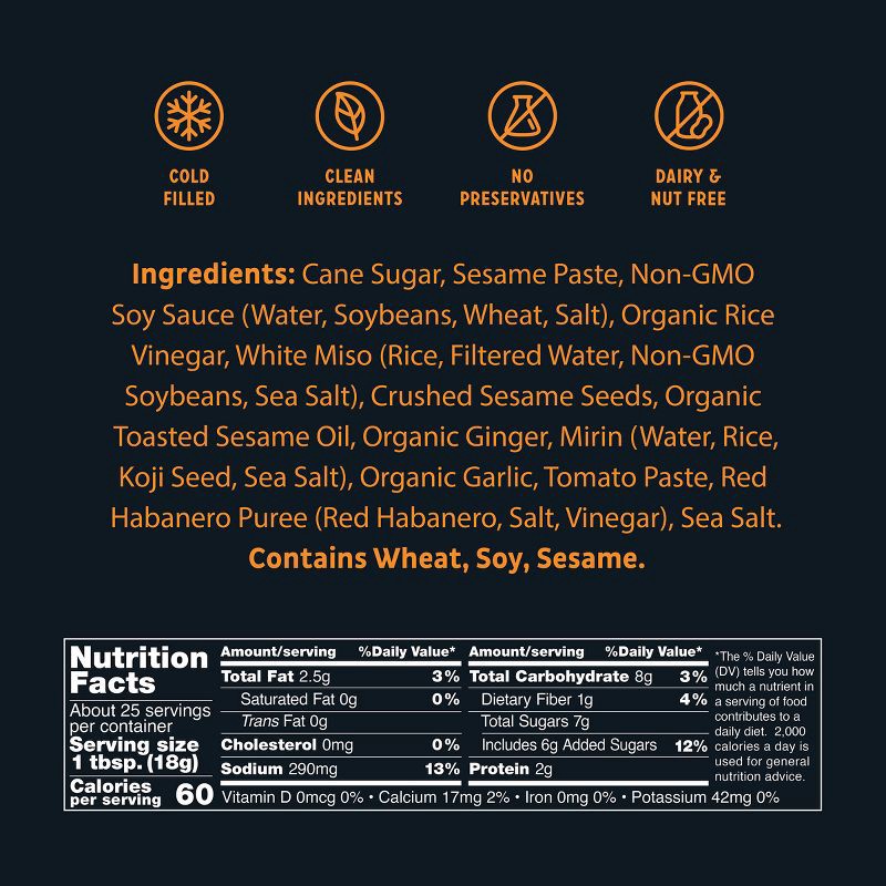 Cane Sugar, Sesame Paste, Non-GMO Soy Sauce (Water, Soybeans, Wheat, Salt), Organic Rice Vinegar, White Miso (Rice, Filtered Water, Non-GMO Soybeans, Sea Salt), Crushed Sesame Seeds, Organic Toasted S…