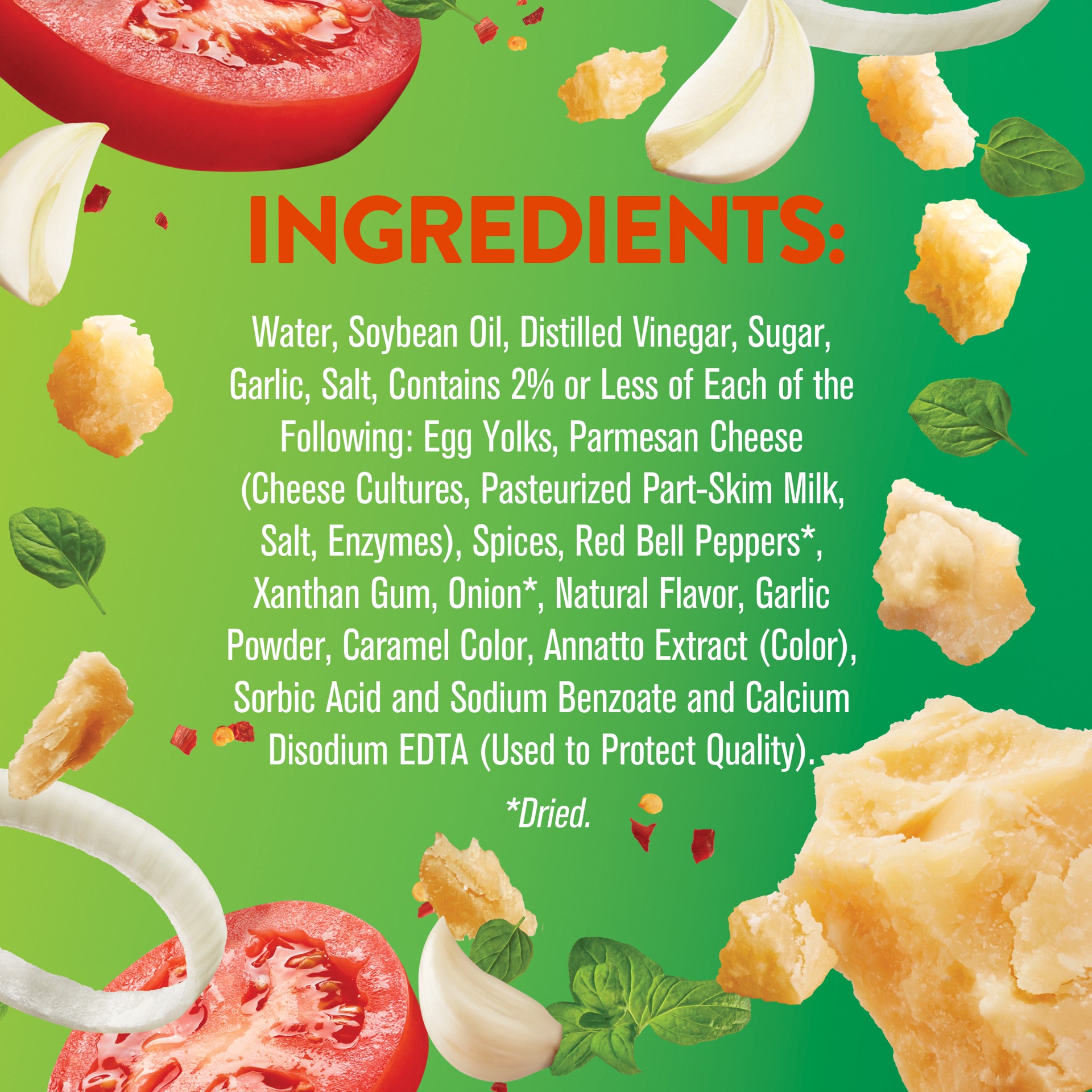 Water, Soybean Oil, Distilled Vinegar, Sugar, Salt, Less than 2% of: Garlic*, Parmesan Cheese (Pasteurized Part Skim Milk, Cheese Cultures, Salt, Enzymes), Egg Yolks*, Spices, Red Bell Pepper*, Xantha…