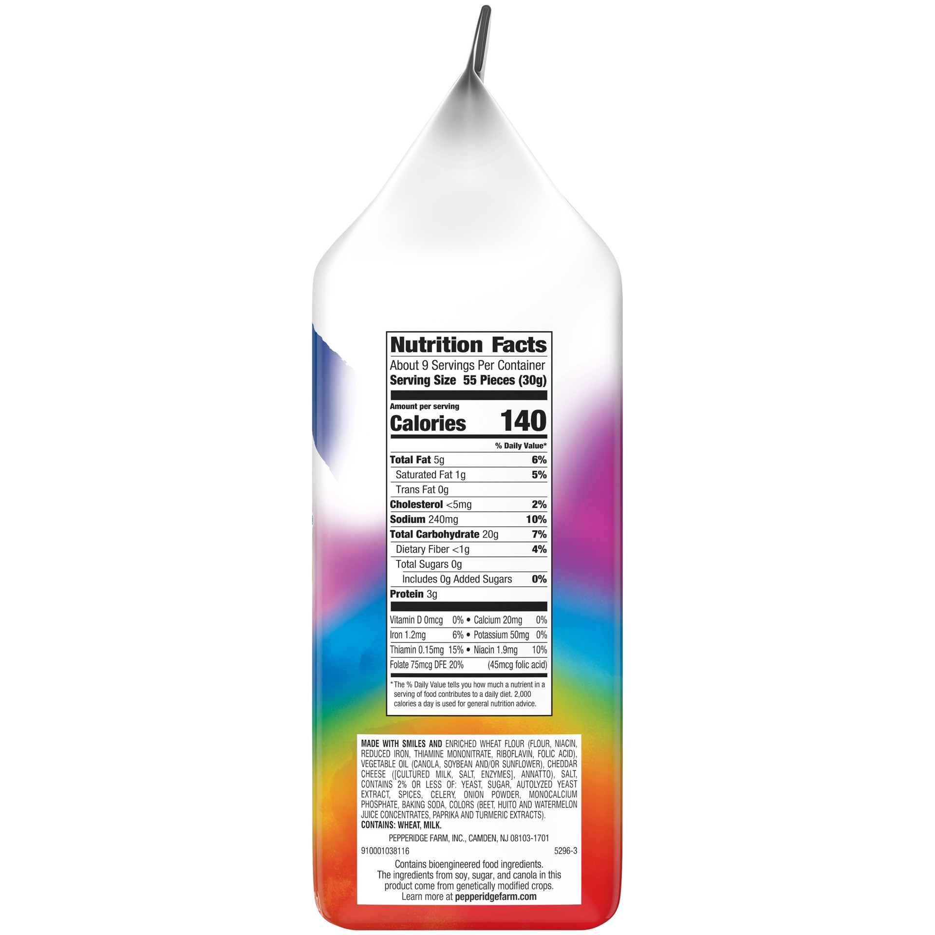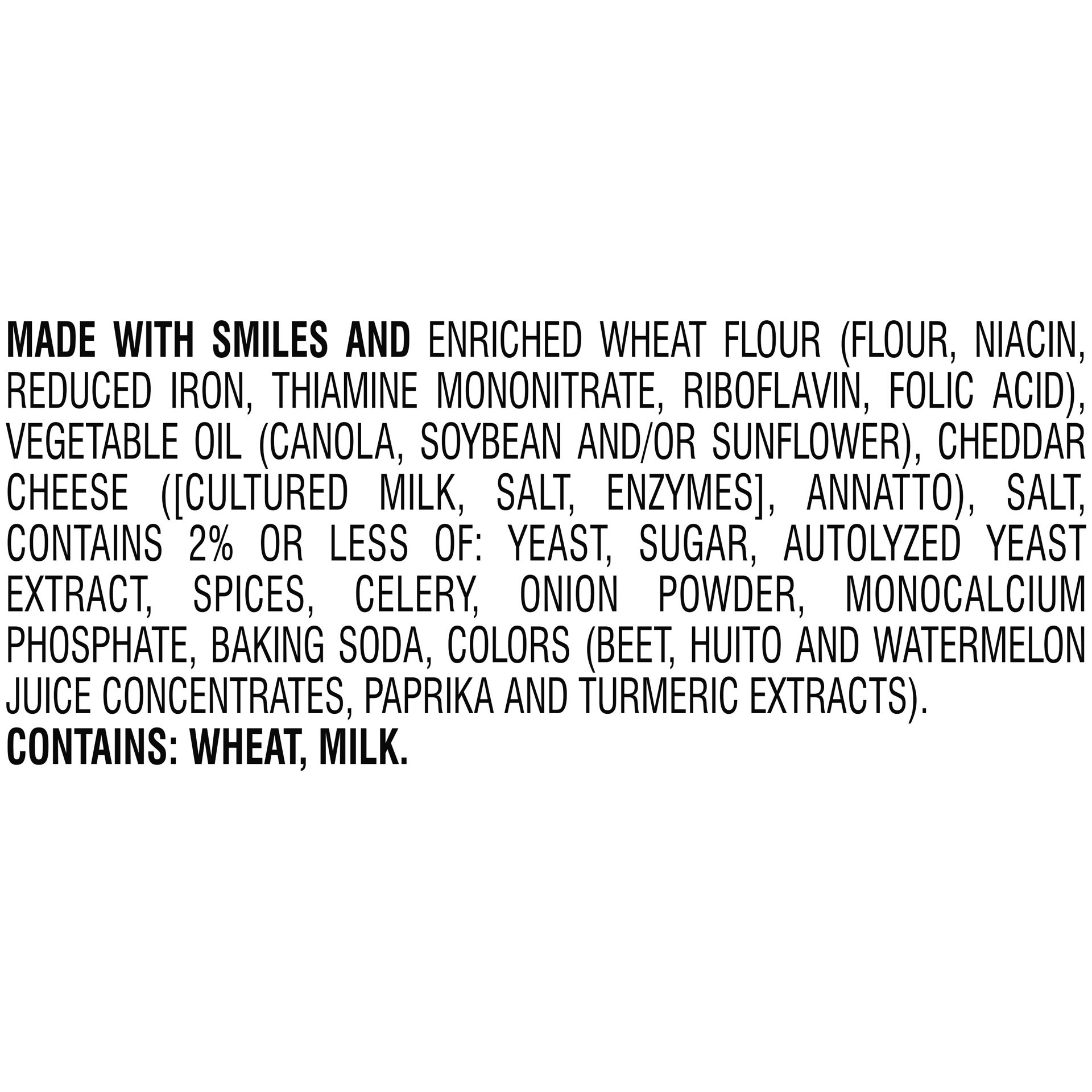 MADE WITH SMILES AND ENRICHED WHEAT FLOUR (FLOUR, NIACIN, REDUCED IRON, THIAMINE MONONITRATE, RIBOFLAVIN, FOLIC ACID), VEGETABLE OIL (CANOLA, SOYBEAN AND/OR SUNFLOWER), CHEDDAR CHEESE ([CULTURED MILK,…