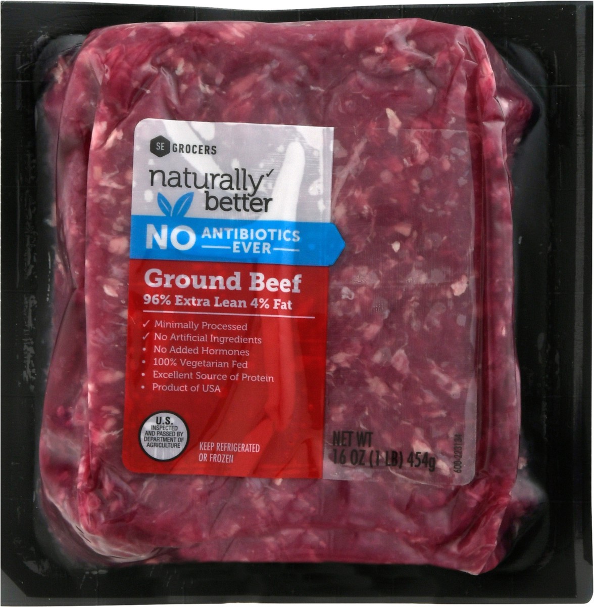No antibiotics ever. 96% extra lean / 4% fat. Minimally processed. No added hormones. 100% vegetarian fed.