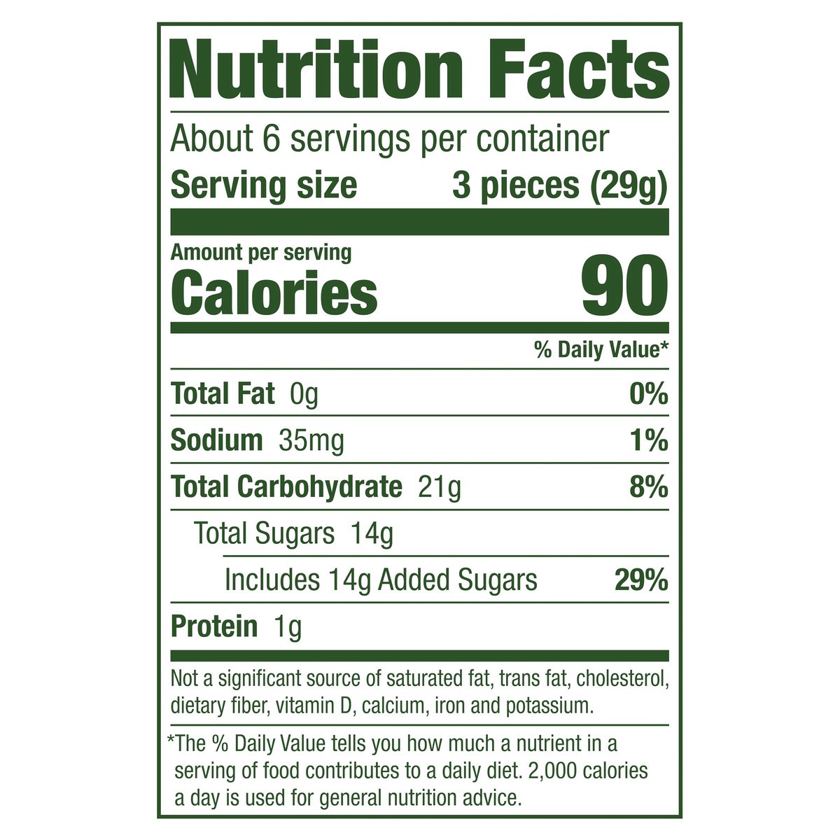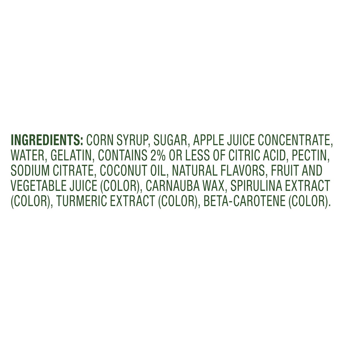 Corn Syrup, Sugar, Apple Juice Concentrate, Water, Gelatin, Contains 2% or Less of Citric Acid, Pectin, Sodium Citrate, Coconut Oil, Natural Flavors, Fruit and Vegetable Juice (Color), Carnauba Wax, S…