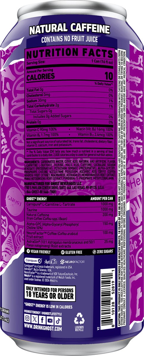 - TOTAL TRANSPARENCY: All Ghost products feature a transparent label that fully discloses the dose of each active ingredient. Zero proprietary blends means you know what you’re getting in each and every sip. Ghost Energy contains zero-sugars and is vegan-friendly and gluten-free.