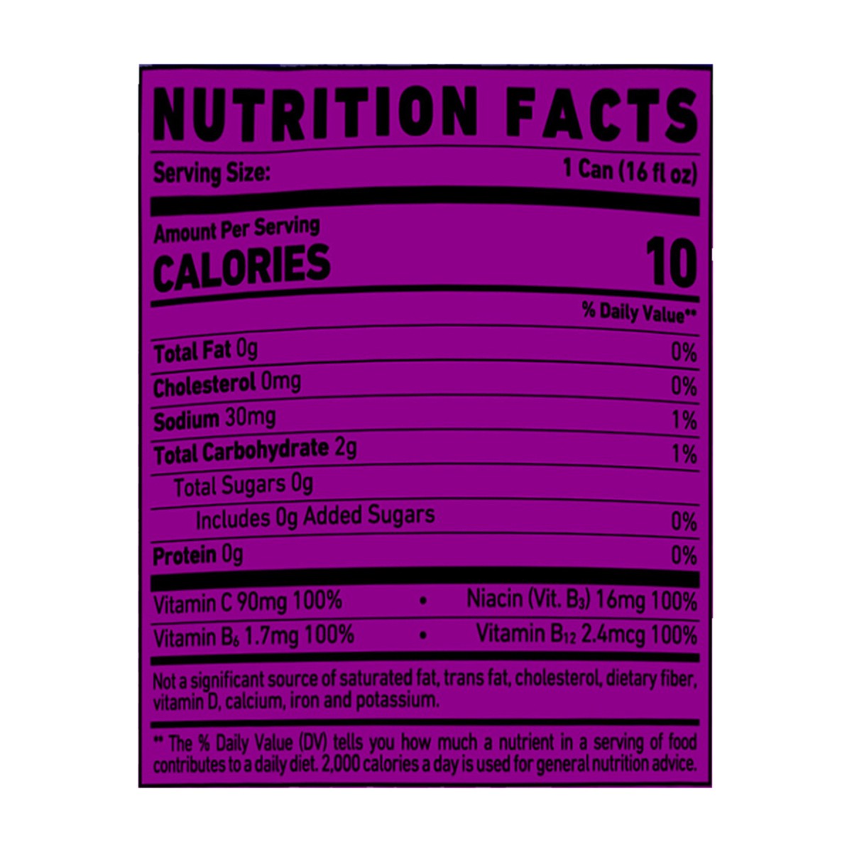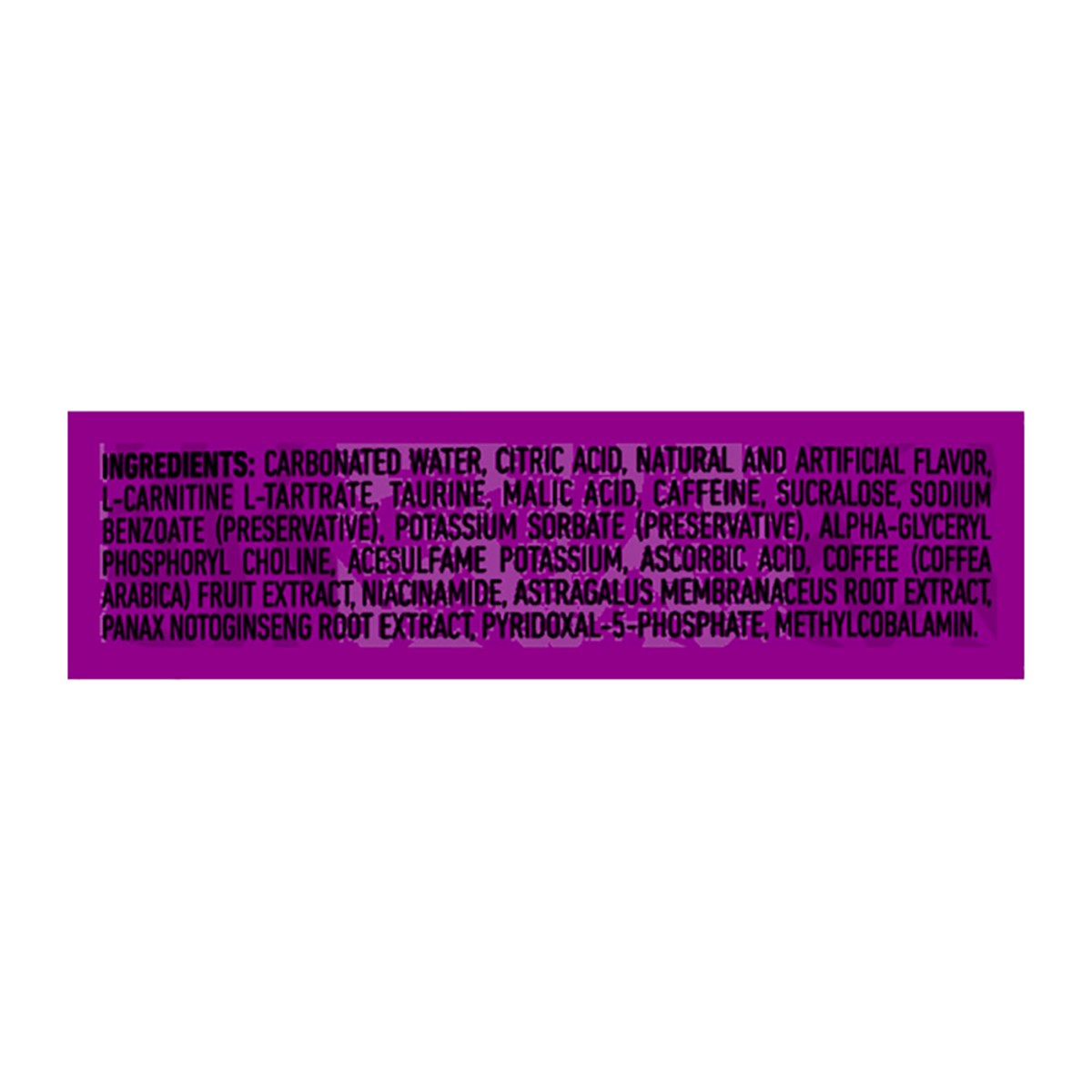 Carbonated Water, Citric Acid, Natural and Artificial Flavor L-Carnitine L-Tartrate, Taurine, Malic Acid, Caffeine, Sucralose, Sodium Benzoate (Preservative), Potassium Sorbate (Preservative), Alpha-G…