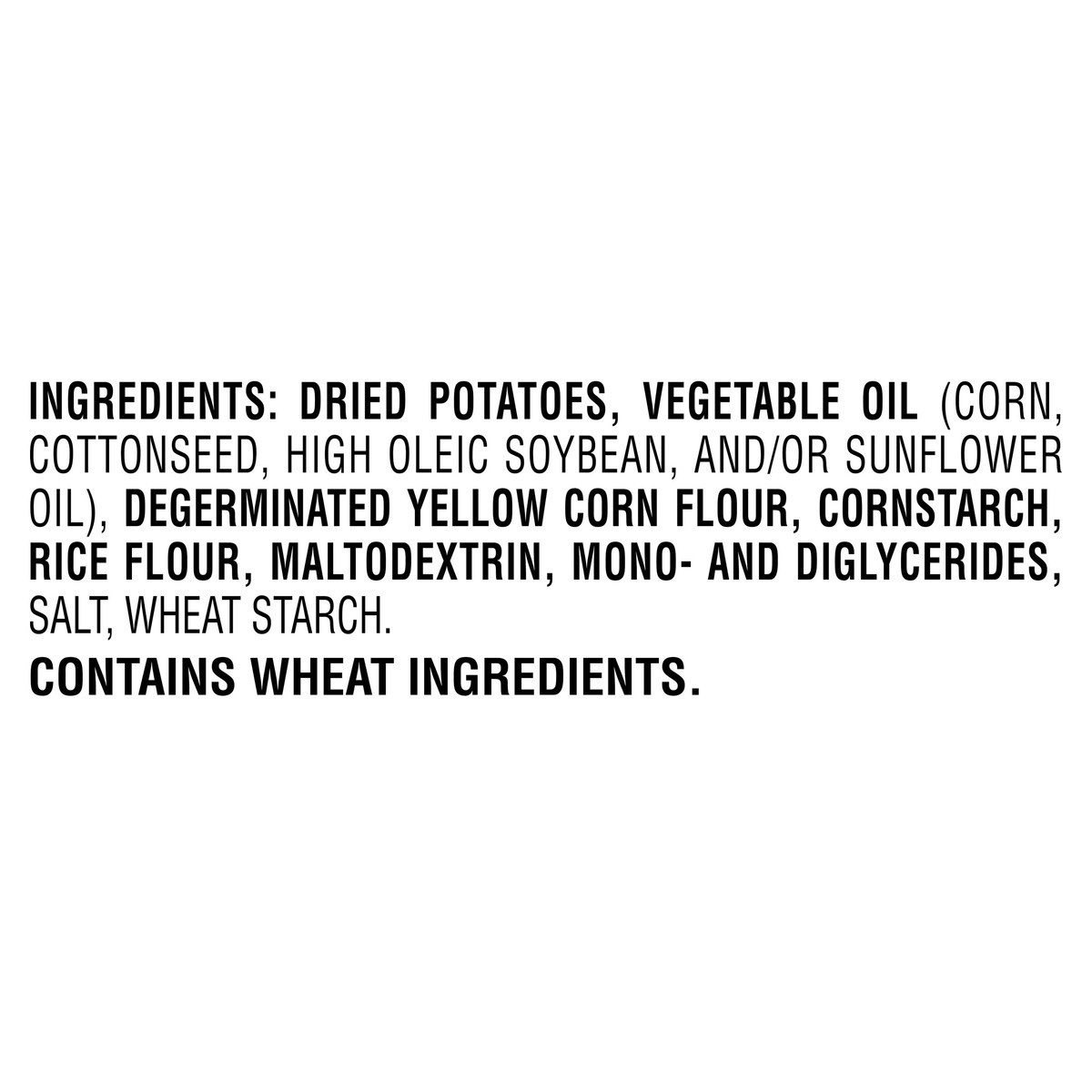 Dried Potatoes, Vegetable Oil (Corn, Cottonseed, High Oleic Soybean, and/or Sunflower Oil), Degerminated Yellow Corn Flour, Cornstarch, Rice Flour, Maltodextrin, Mono and Diglycerides, Salt, Wheat Sta…
