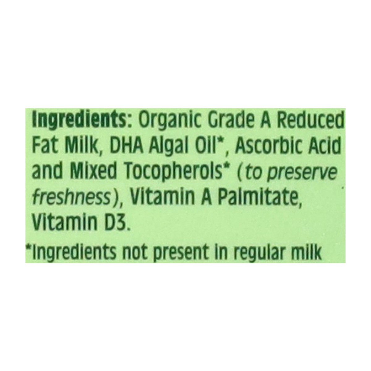 Organic Grade A Reduced Fat Milk, DHA Algal Oil*, Ascorbic Acid and Mixed Tocopherols* (to Preserve Freshness), Vitamin A Palmitate, Vitamin D3. *Ingredients Not Present in Regular Milk.