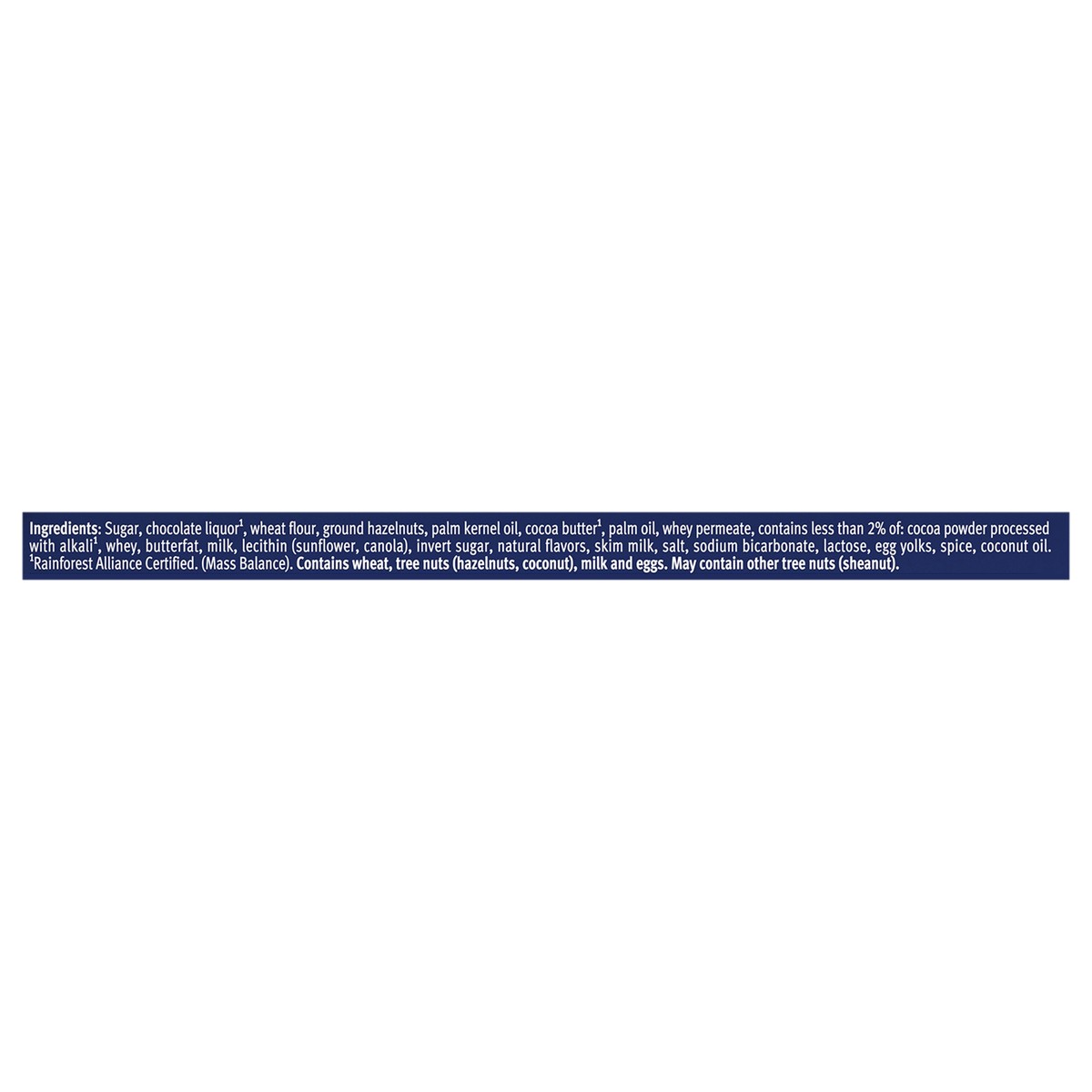 Sugar, Chocolate Liquor(1), Wheat Flour, Ground Hazelnuts, Palm Kernel Oil, Cocoa Butter(1), Palm Oil, Whey Permeate, Contains Less than 2% of: Cocoa Powder Processed with Alkali(1), Whey, Butterfat, …
