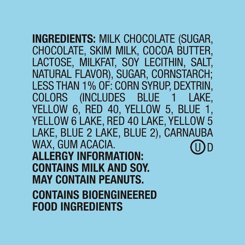 MILK CHOCOLATE (SUGAR, CHOCOLATE, SKIM MILK, COCOA BUTTER, LACTOSE, MILKFAT, SOY LECITHIN, SALT, NATURAL FLAVOR), SUGAR, CORNSTARCH; LESS THAN 1% OF: CORN SYRUP, DEXTRIN, COLORS (INCLUDES BLUE 1 LAKE,…