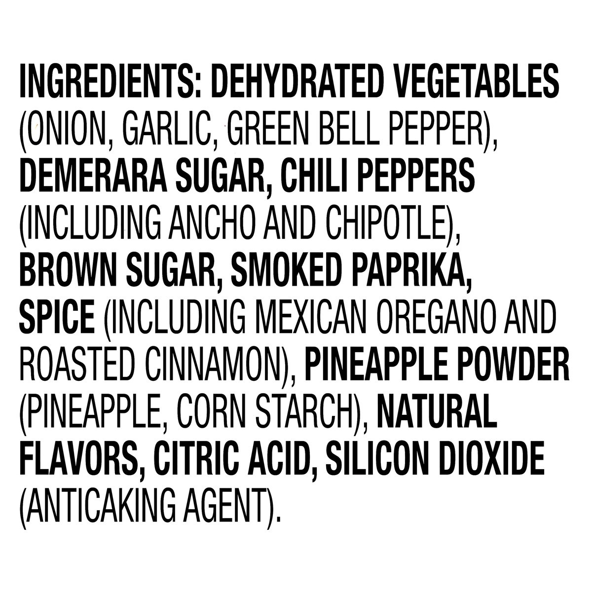 Dehydrated Vegetables (Onion, Garlic, Green Bell Pepper), Demerara Sugar, Chili Peppers (Including Ancho and Chipotle), Brown Sugar, Smoked Paprika, Spice (Including Mexican Oregano and Roasted Cinnam…