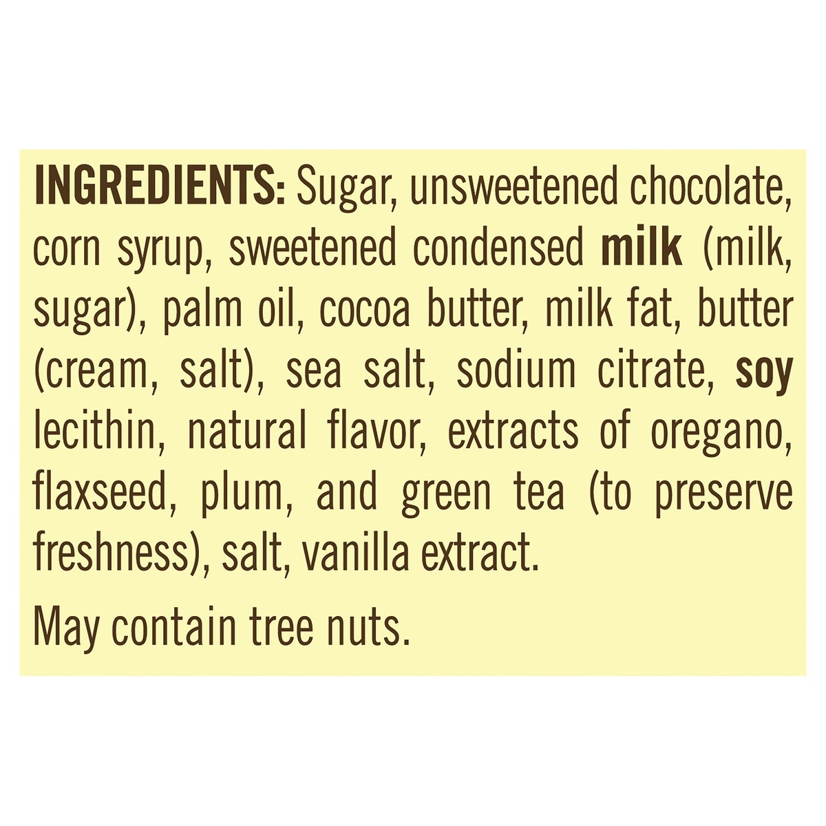 Sugar, Unsweetened Chocolate, Corn Syrup, Sweetened Condensed Milk (Milk, Sugar), Palm Oil, Cocoa Butter, Milk Fat, Butter (Cream, Salt), Sea Salt, Sodium Citrate, Soy Lecithin, Natural Flavor, Extrac…