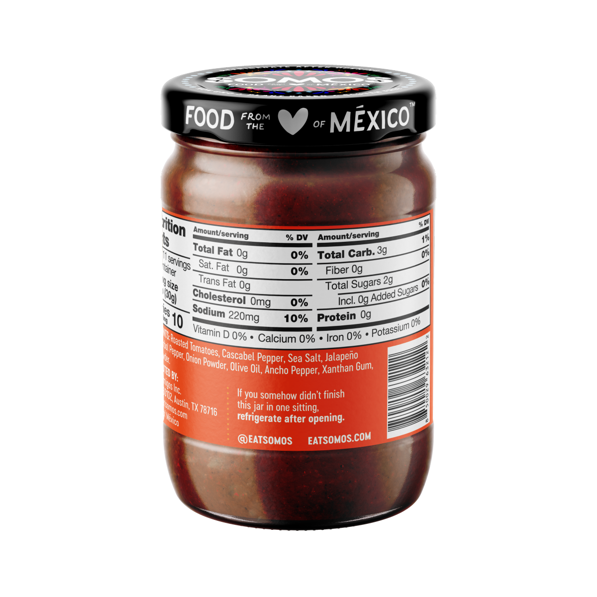Roasted Tomatoes, Cascabel Peppers, Sea Salt, Jalapeno Peppers, Arbol Peppers, Onion Powder, Olive Oil, Ancho Peppers, Xanthan Gum, Garlic Powder.