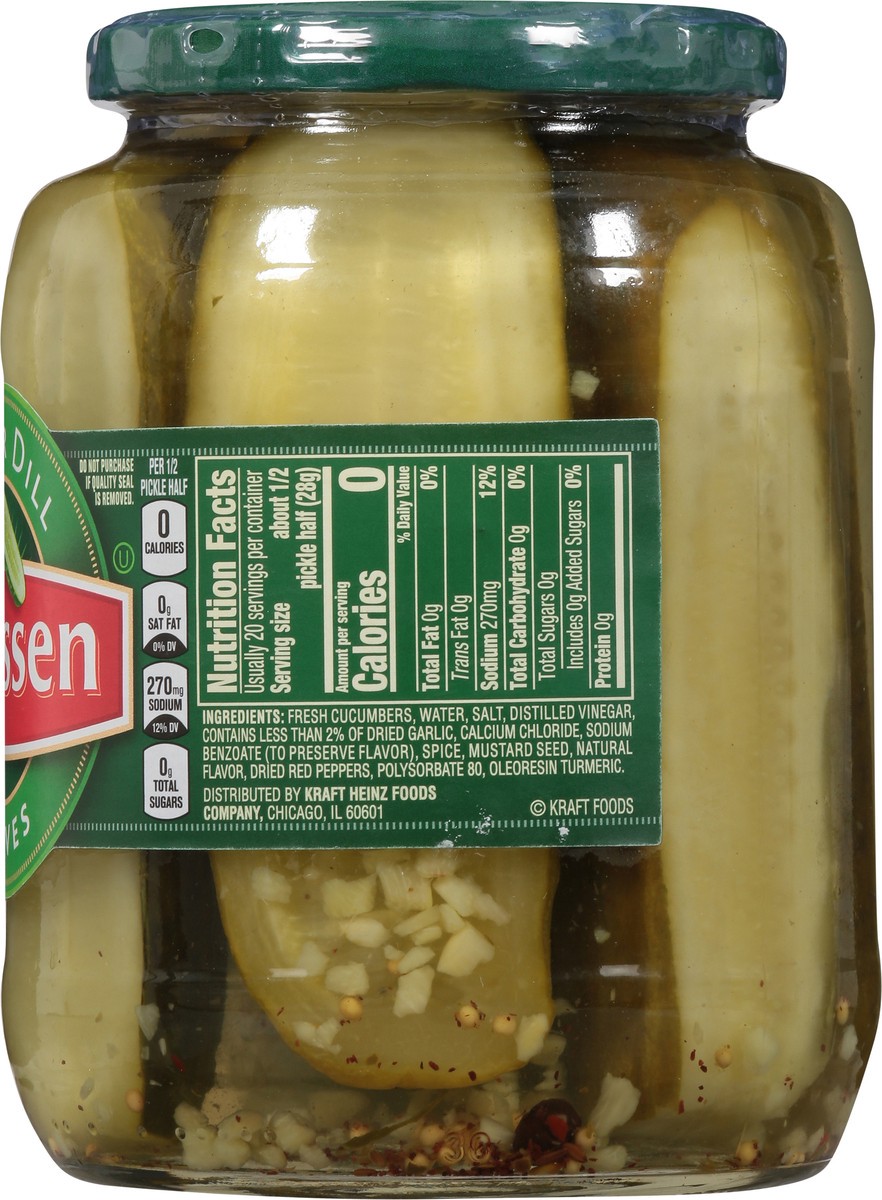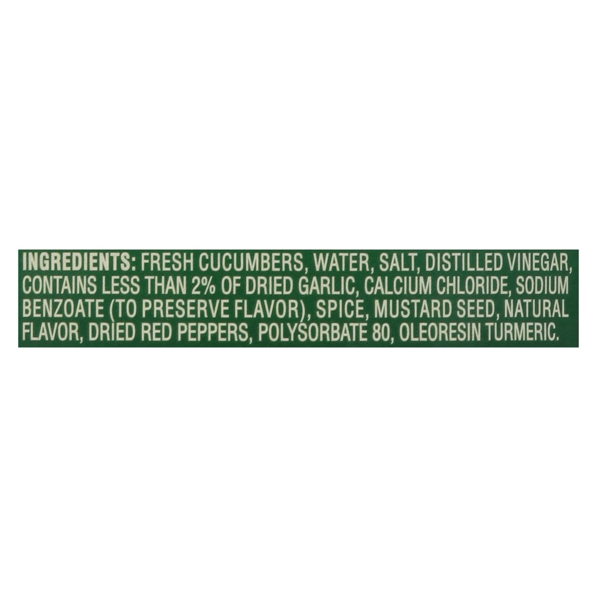 FRESH CUCUMBERS, WATER, SALT, DISTILLED VINEGAR, CONTAINS LESS THAN 2% OF DRIED GARLIC, CALCIUM CHLORIDE, SODIUM BENZOATE (TO PRESERVE FLAVOR), SPICE, MUSTARD SEED, NATURAL FLAVOR, DRIED RED PEPPERS, …