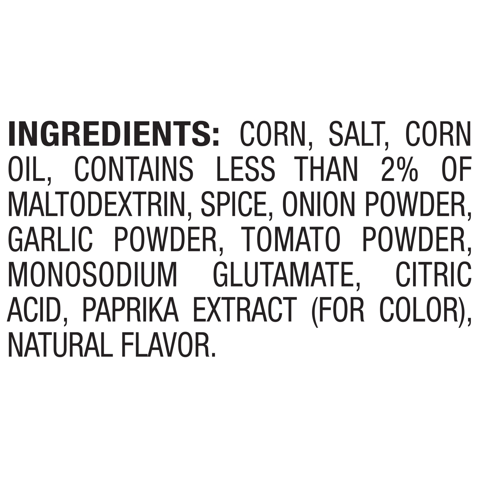 Corn, Salt, Corn Oil, Contains Less than 2% of Maltodextrin, Spice, Onion Powder, Garlic Powder, Tomato Powder, Monosodium Glutamate, Citric Acid, Paprika Extract (for Color), Natural Flavor.