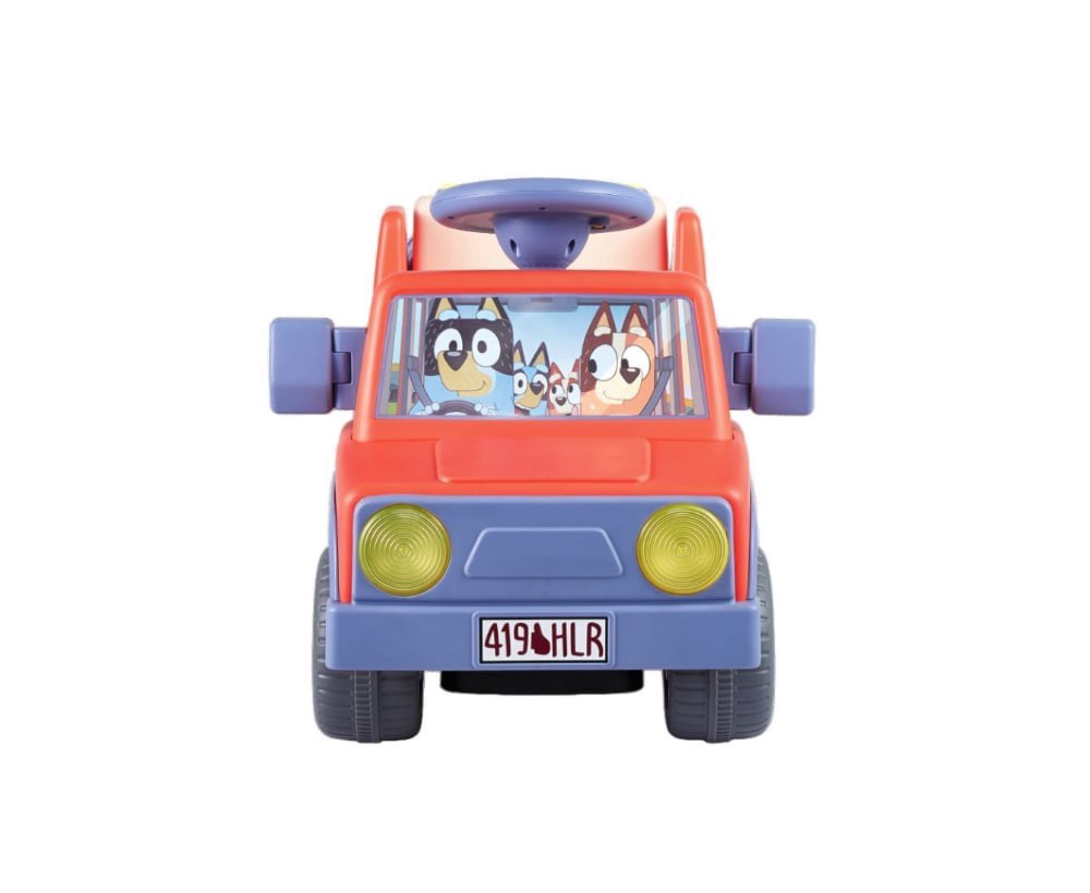 Bluey 6V Vehicle - Lights & Sounds Steering wheel plays quotes and songs from the show Spare tire storage case and cup holder Rechargeable 6 volt battery Real working headlights and adjustable and ref…