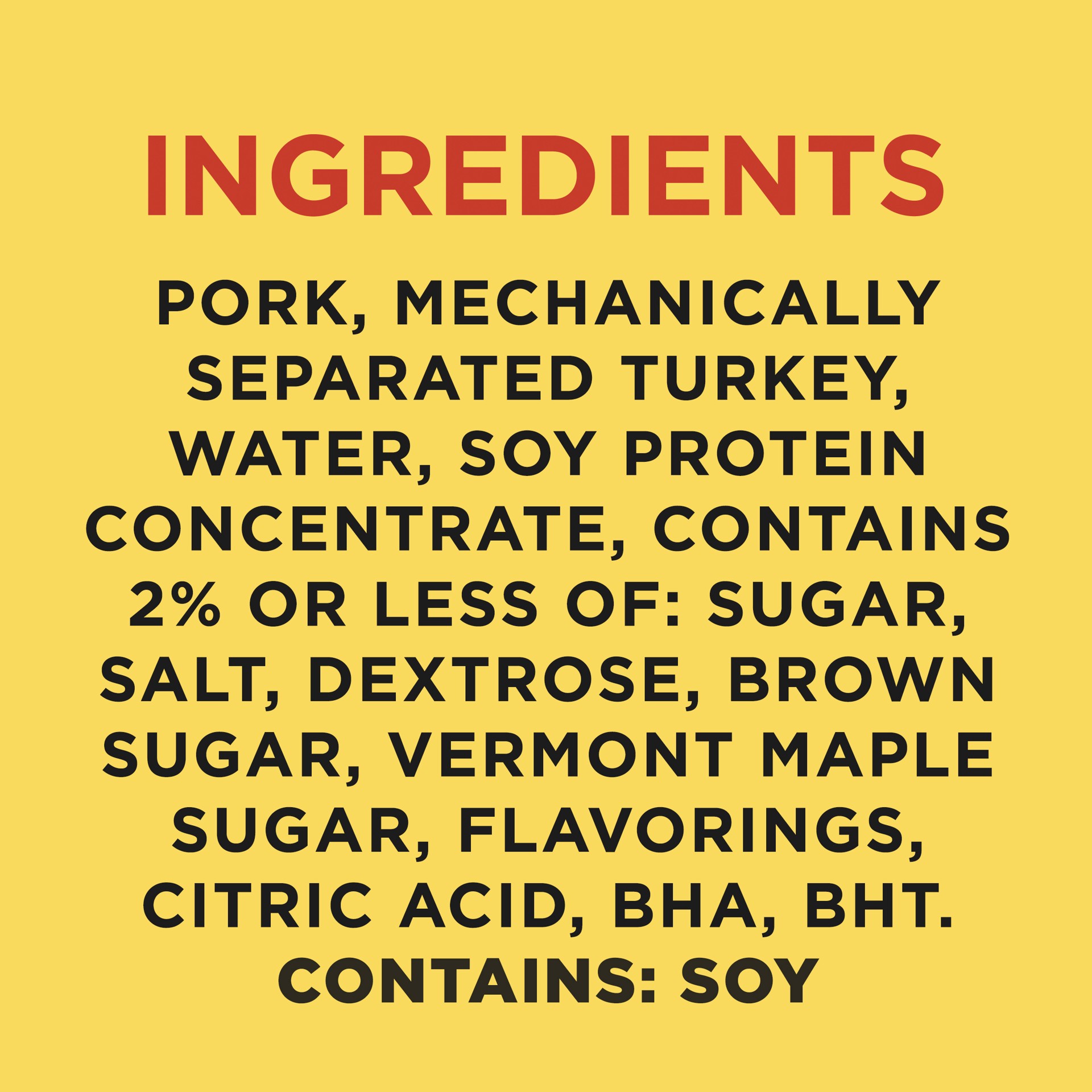 Pork, Mechanically Separated Turkey, Water, Soy Protein Concentrate, Contains 2% or Less of: Sugar, Salt, Dextrose, Brown Sugar, Vermont Maple Sugar, Flavorings, Citric Acid, BHA, BHT.