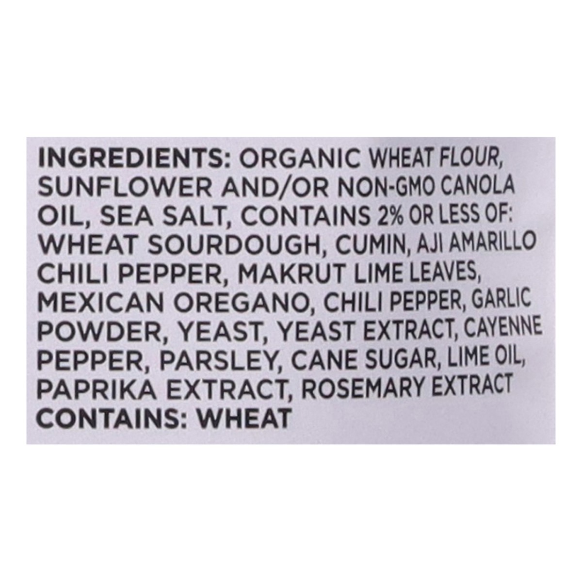 Organic Wheat Flour, Sunflower And/Or Non-GMO Canola Oil, Sea Salt, Contains 2% Or Less Of: Wheat Sourdough, Cumin, Aji Amarillo Chili Pepper, Makrut Lime Leaves, Mexican Oregano, Chili Pepper, Garlic…