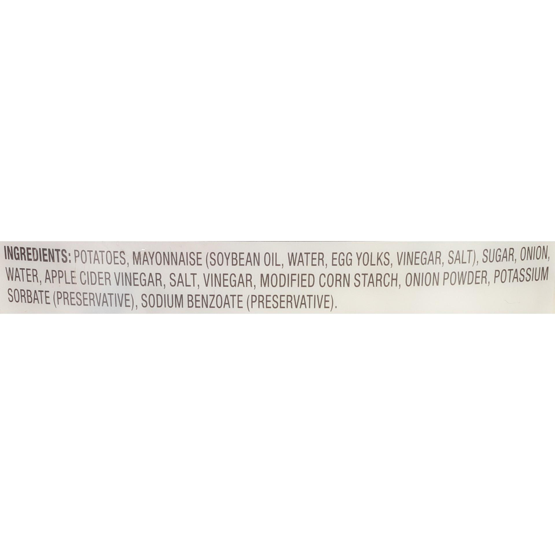 Potatoes, Mayonnaise (Soybean Oil, Water, Egg Yolks, Vinegar, Salt), Sugar, Onion, Water, Apple Cider Vinegar, Salt, Vinegar, Modified Corn Starch, Onion Powder, Potassium Sorbate (Preservative). Sodi…