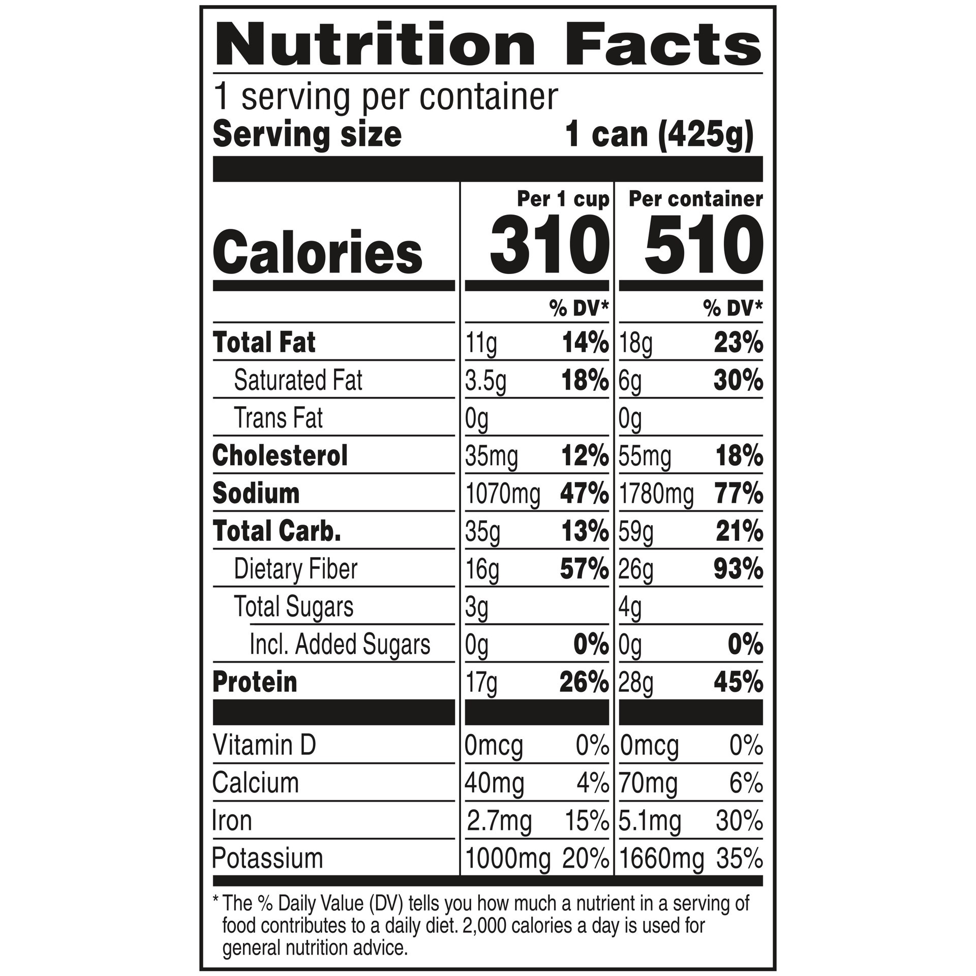 Prepared Pinto Beans (Pinto Beans, Water), Water, Meat Ingredients (Beef and Pork), Tomato Puree (Water, Tomato Paste), Contains less than 2% of: Modified Corn Starch, Chili Pepper, Salt, Defatted Soy…