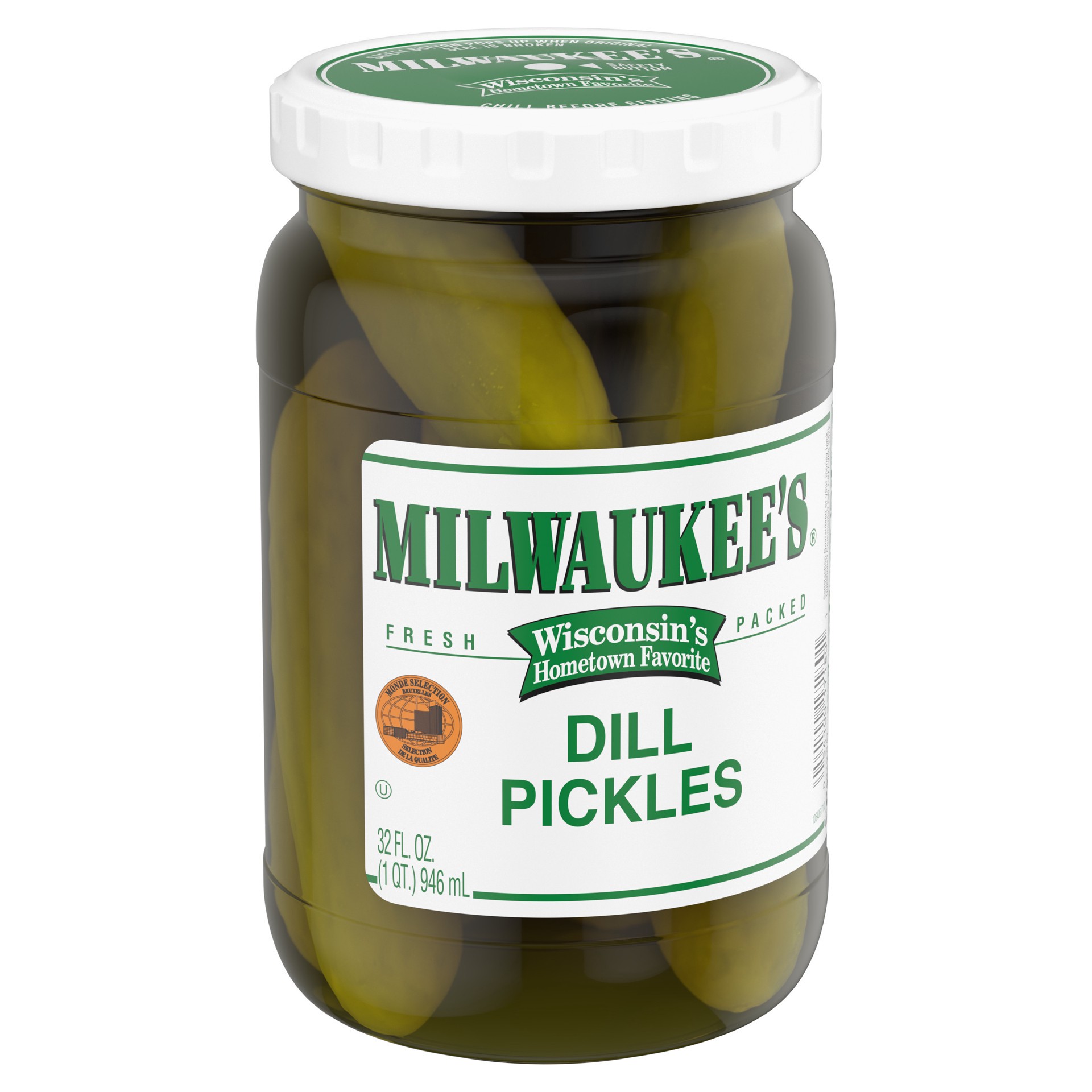 Enjoy the taste of a classic dill pickle with a crisp, satisfying crunch. Milwaukee's Dill Pickles are made with fresh cucumbers for a naturally fat-free food. Reach for this fresh-packed, 32-ounce ja…