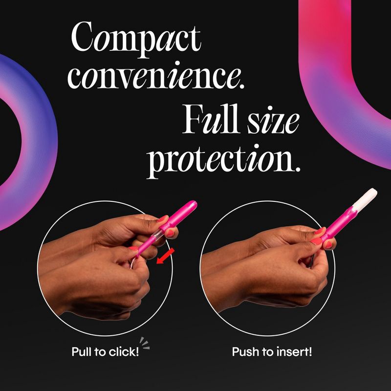 When you need compact comfort and powerful protection, U by Kotex Click compact tampons are ready to help. Each tampon features a smooth tip for easy and comfortable insertion and provides up to 100% …