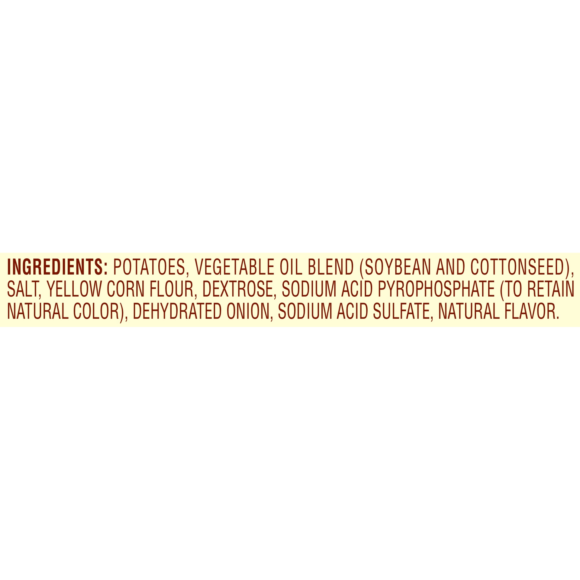 Potatoes, Vegetable Oil (Soybean and/or Cottonseed), Salt, Corn Flour, Dextrose, Sodium Acid Pyrophosphate (to Retain Natural Color), Dehydrated Onions, Sodium Acid Sulfate, Natural Flavor.