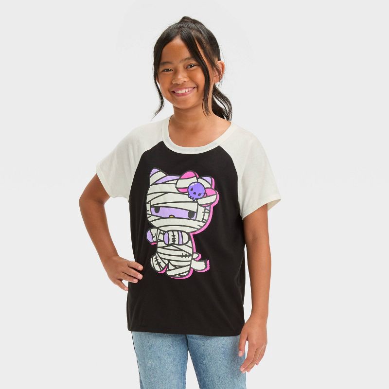 Help your kid join the Halloween party with their favorite character by wearing the Hello Kitty Halloween Short-Sleeve Graphic T-Shirt. This raglan-sleeve graphic T-shirt showcases Hello Kitty in a mu…