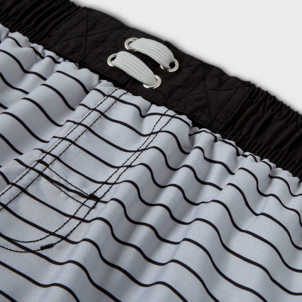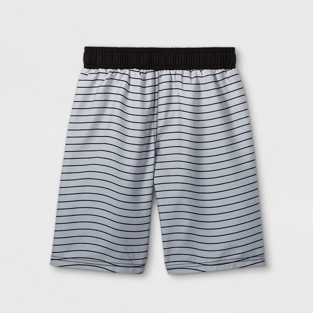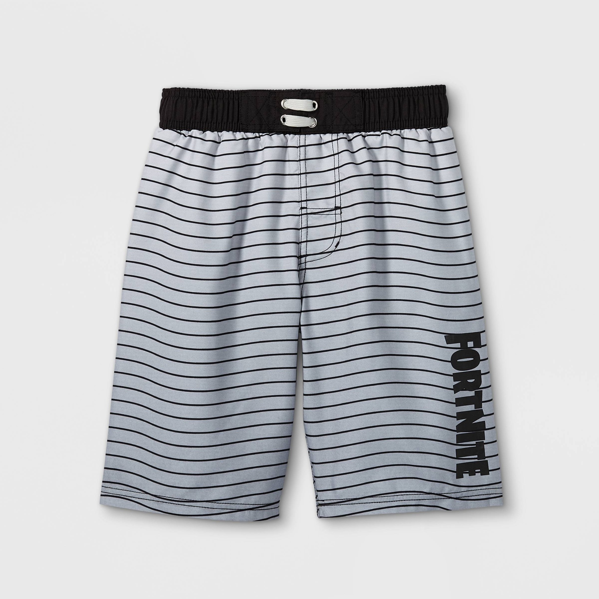 Your boy can now show off his passion for his fave video game while having fun in the water with the Fortnite Ombre Swim Trunks. These boys' swim shorts are adorned with a black horizontal striped pri…