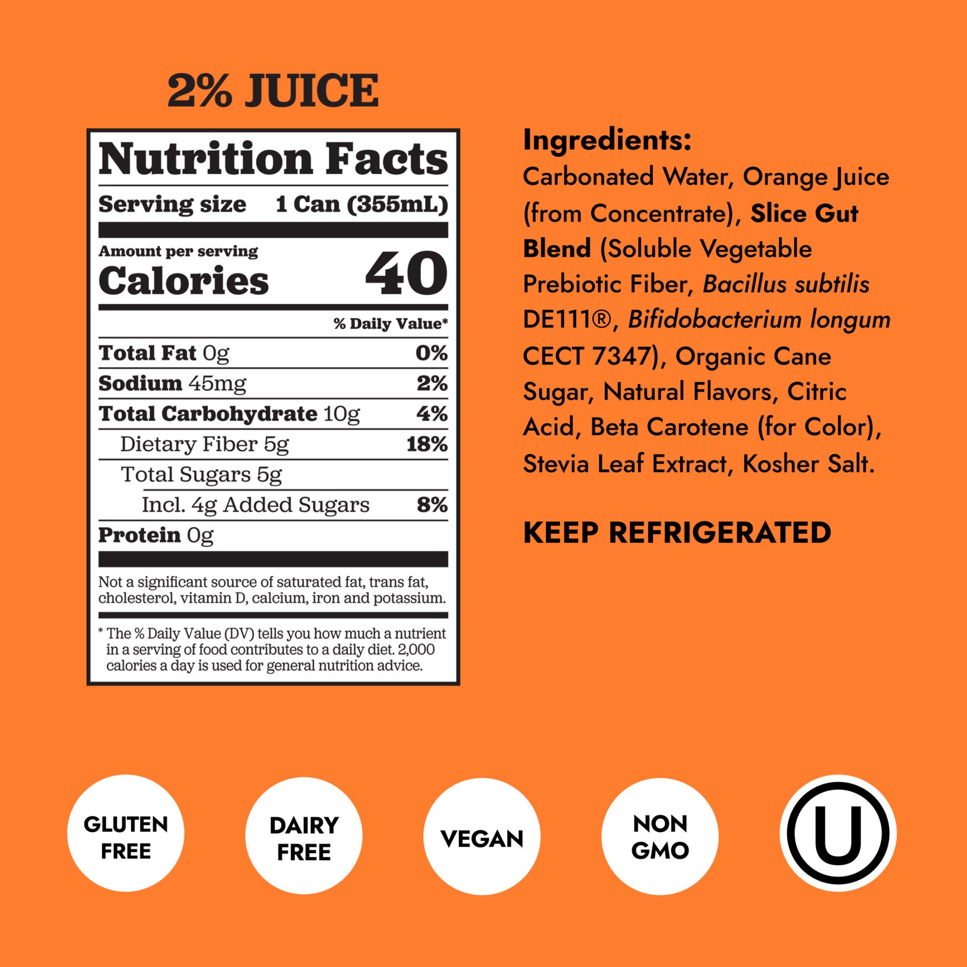 Carbonated Water, Orange Juice (from Concentrate), Slice Gut Blend (Soluble Vegetable Prebiotic Fiber, Bacillus subtilis DE111, Bifidobacterium longum CECT 7347), Organic Cane Sugar, Natural Flavors, …