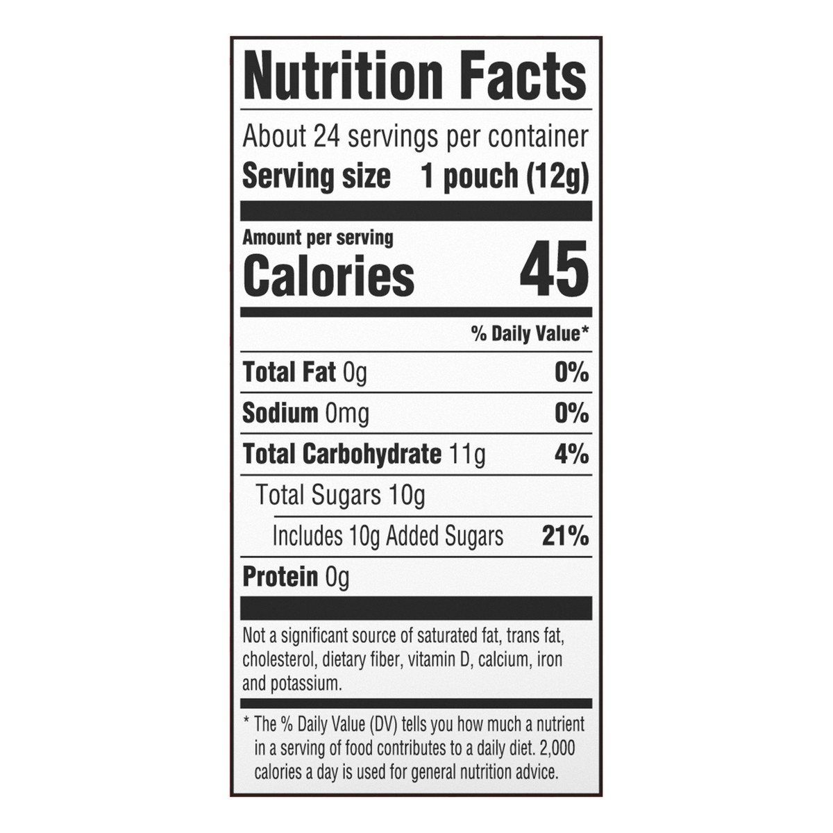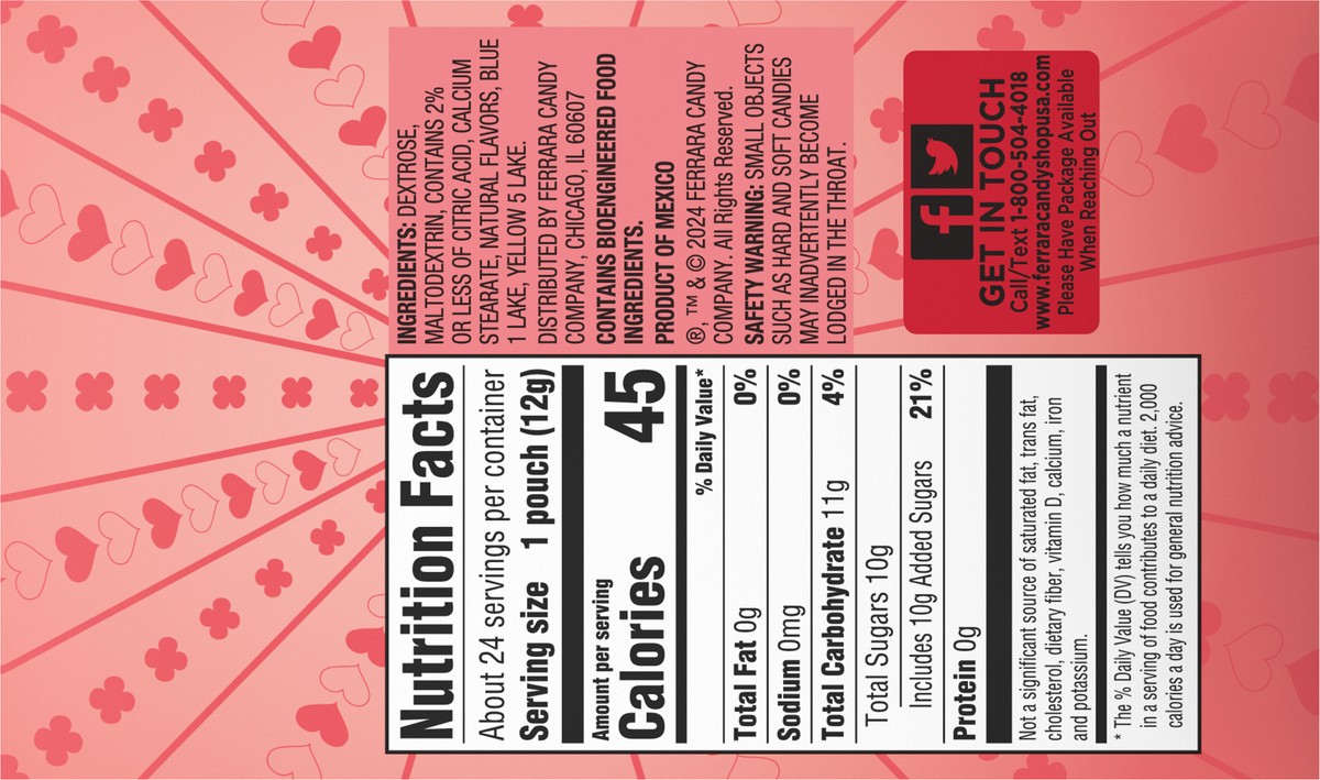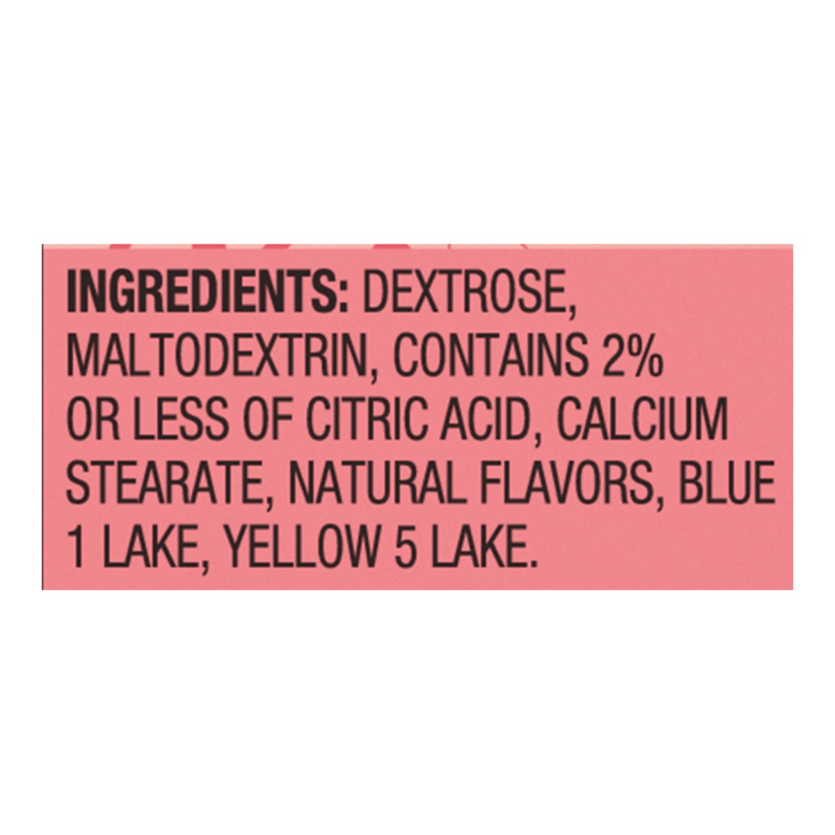 Dextrose, Maltodextrin, Contains 2% or Less of Citric Acid, Calcium Stearate, Natural Flavors, Blue 1 Lake, Yellow 5 Lake.