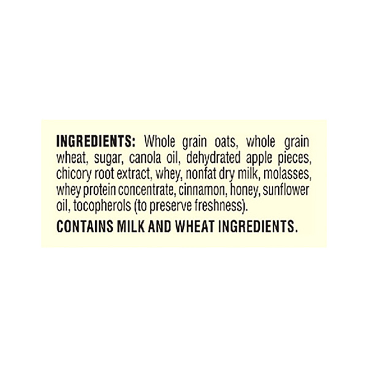 Whole Grain Oats, Whole Grain Wheat, Sugar, Canola Oil, Dehydrated Apple Pieces, Chicory Root Extract, Whey, Nonfat Dry Milk, Molasses, Whey Protein Concentrate, Cinnamon, Honey, Sunflower Oil, Tocoph…