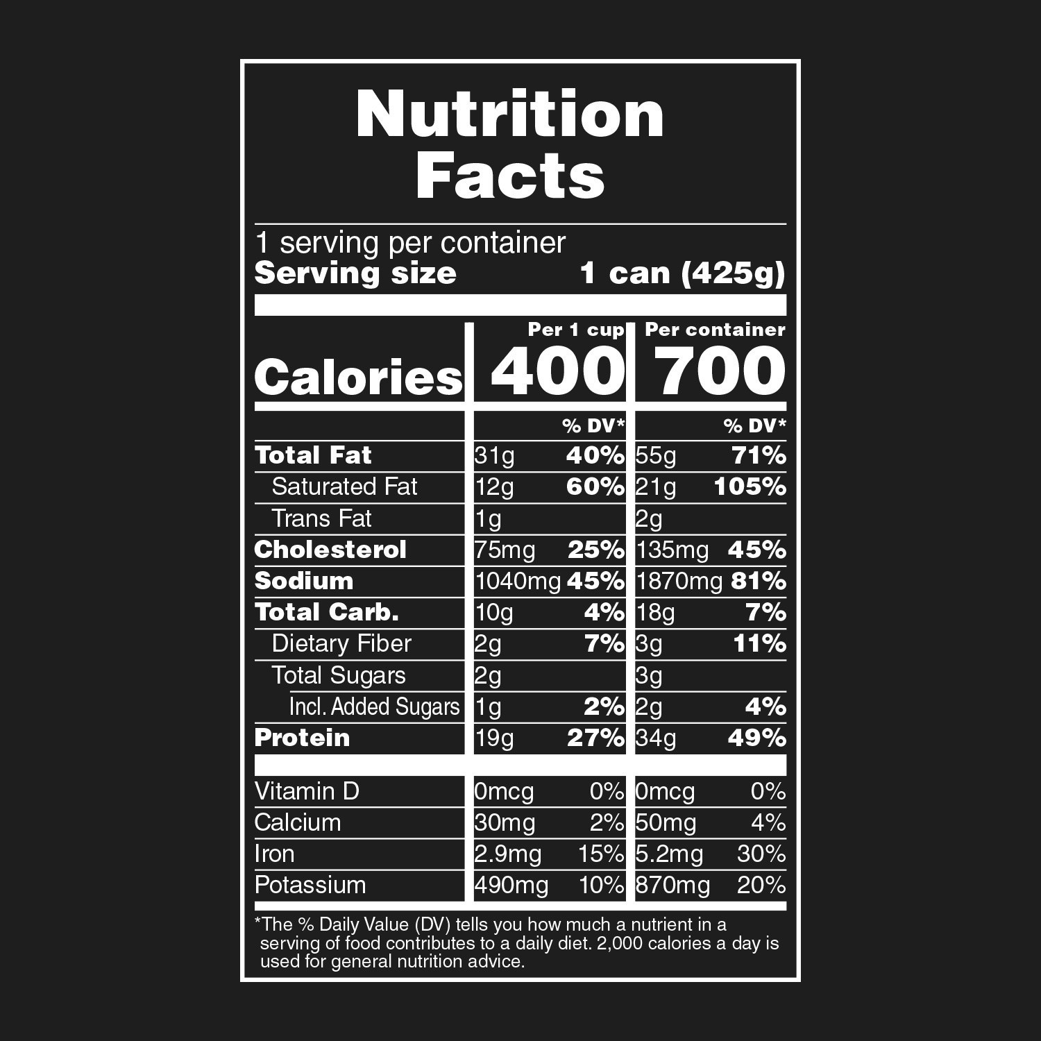 Angus Beef, Water, Beef Broth, Tomato Puree (Water, Tomato Paste), Chili Pepper, Degermed Corn Flour, Contains less than 2% of the following: Modified Corn Starch, Salt, Sugar, Spices, Garlic Powder, …