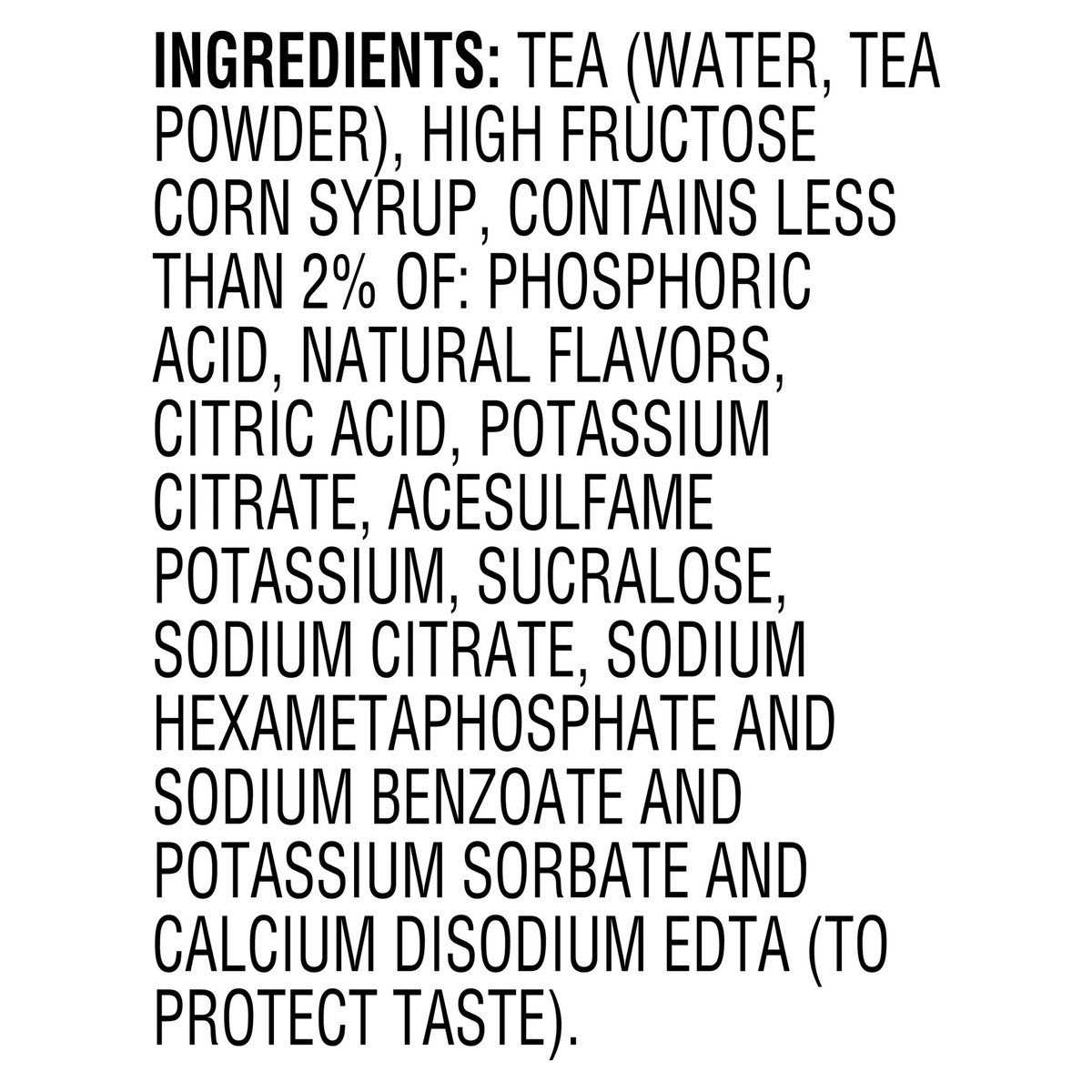 Tea (Water, Tea Powder), High Fructose Corn Syrup, Contains Less Than 2% Of: Phosphoric Acid, Natural Flavors, Citric Acid, Potassium Citrate, Acesulfame Potassium, Sucralose, Sodium Citrate, Sodium H…