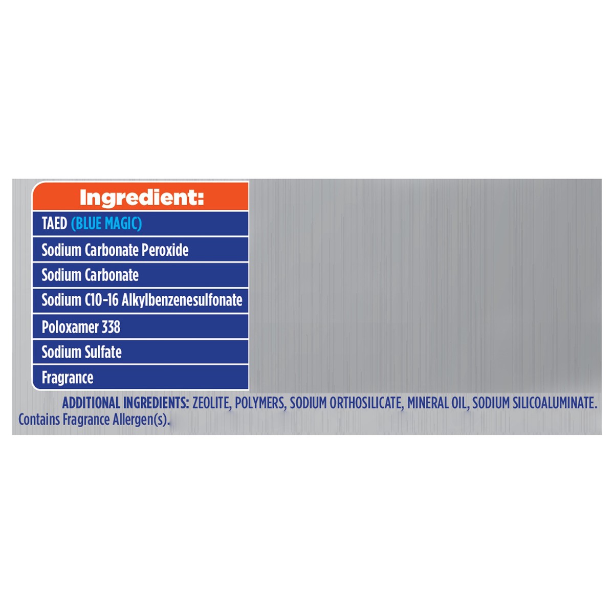 TAED (Blue Magic), Sodium Carbonate Peroxide, Sodium Carbonate, Sodium C10-16 Alkylbenzenesulfonate, Poloxamer 338, Sodium Sulfate, Fragrance. Additional Ingredients: Zeolite, Polymers, Sodium Orthosi…