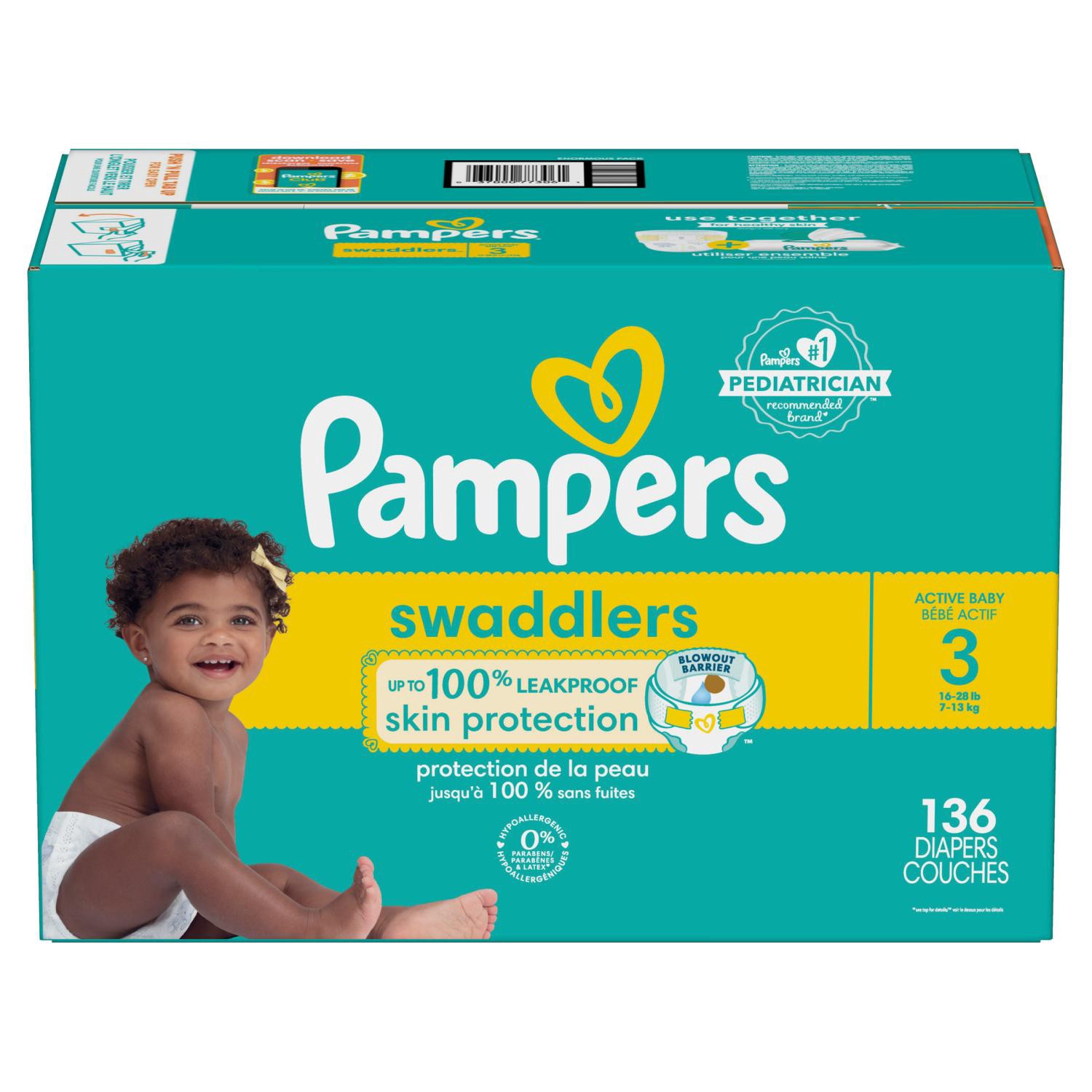 Pampers Swaddlers Diapers, Size S3 (13-26 lbs), 136 Count, Absorbent, Keeps Baby Dry and Comfortable, Pediatrician Recommended Skin Safe Disposable Baby Diaper