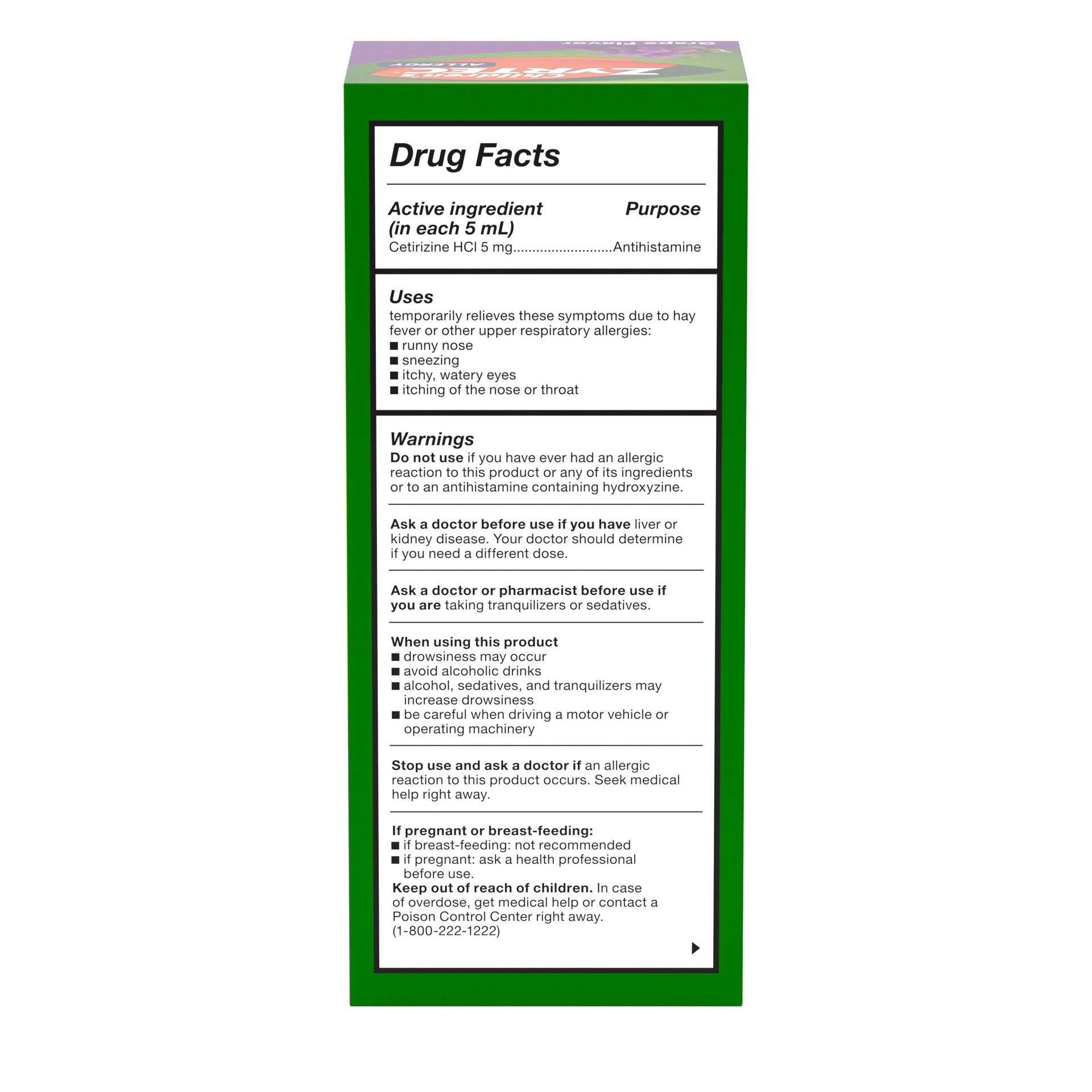 Active ingredient: (in each 5 mL) Cetirizine HCl 5mg. Purpose: Antihistamine. Inactive ingredients: anhydrous citric acid, flavors, propylene glycol, purified water, sodium benzoate, sorbitol solution…