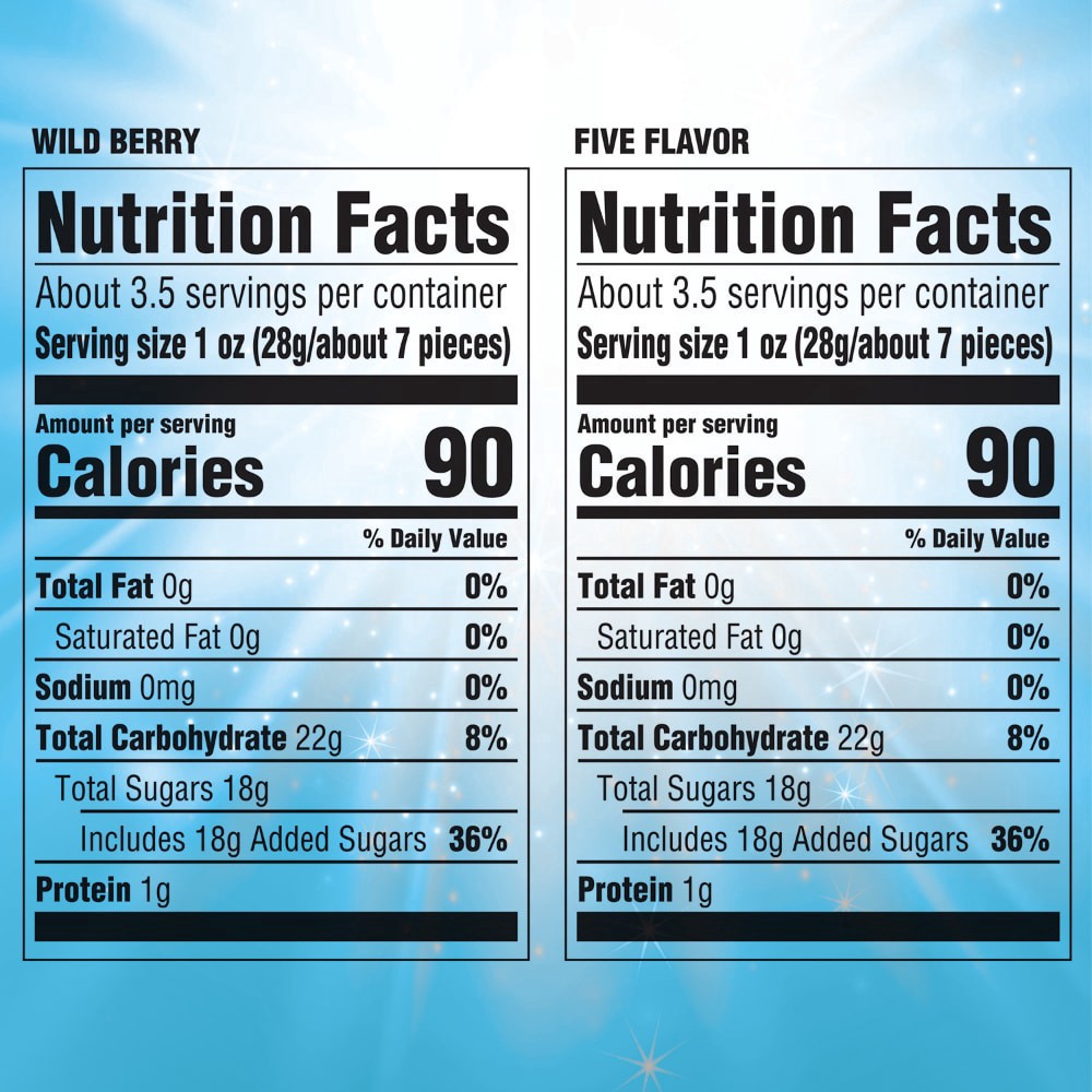 WILD BERRY INGREDIENTS: CORN SYRUP, SUGAR, WATER, MODIFIED CORN STARCH, GELATIN; LESS THAN 2% OF: CITRIC ACID, NATURAL AND ARTIFICIAL FLAVORS, CARNAUBA WAX, COLORS (RED 40, BLUE 1, YELLOW 5), MINERAL …