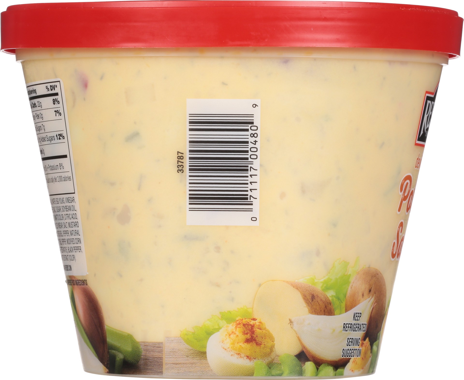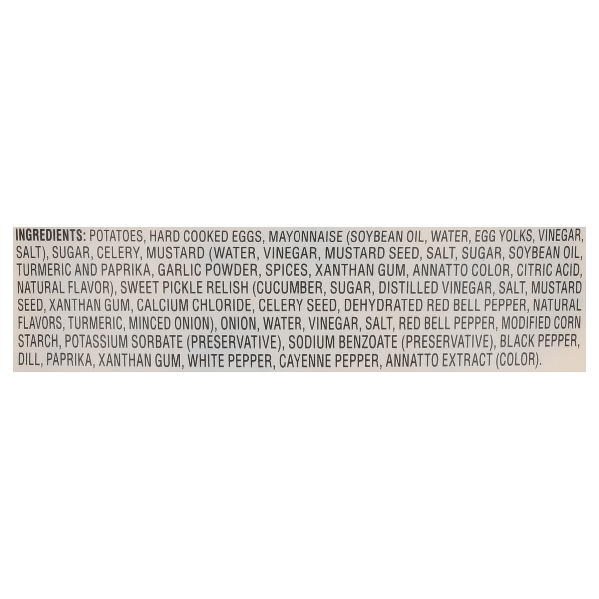 Potatoes, Hard Cooked Eggs, Mayonnaise (Soybean Oil, Water, Egg Yolks, Vinegar, Salt), Sugar, Celery, Mustard (Water, Vinegar, Mustard Seed, Salt, Sugar, Soybean Oil, Turmeric and Paprika, Garlic Powd…