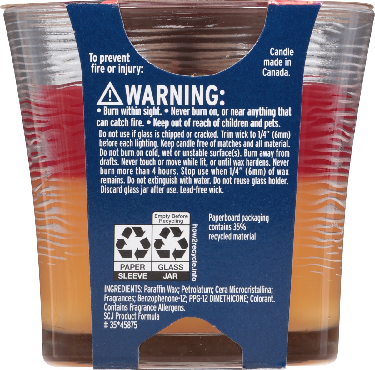 Paraffin Wax; Petrolatum; Cera Microcristallina; Fragrances; Benzophenone-12; PPG-12 Dimethicone; Colorant. SCJ Product Formula # 35*45875.