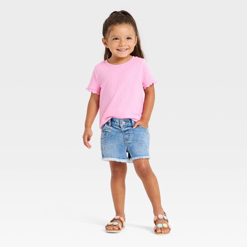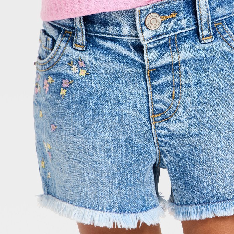 Your toddler will look and feel their adorable best in these Floral Embroidered Denim Cutoff Shorts from Cat & Jack™. Made of cotton-spandex blend fabric with recycled polyester-cotton blend lining, t…