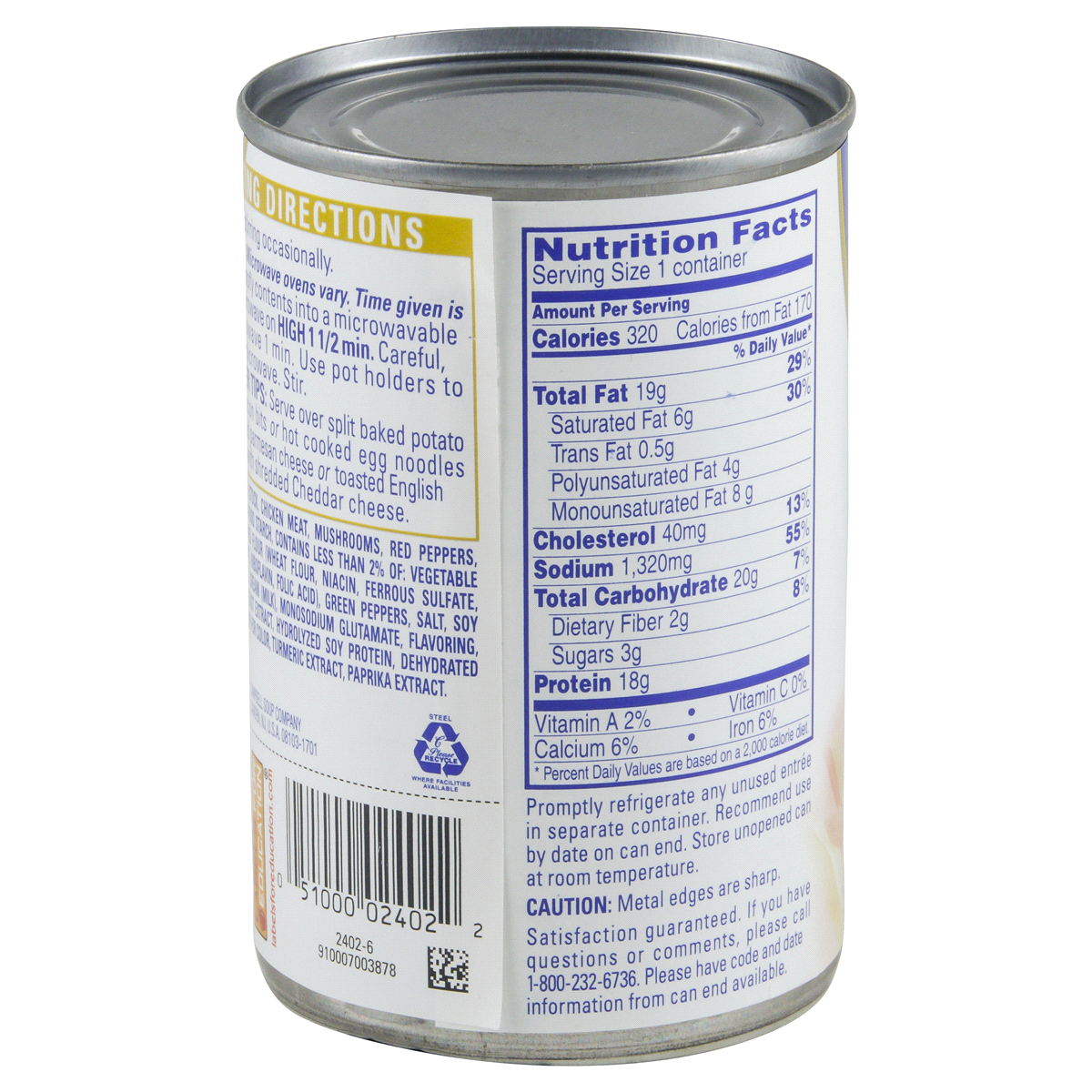 INGREDIENTS: CHICKEN STOCK, CHICKEN MEAT, MUSHROOMS, MODIFIED FOOD STARCH, WATER, VEGETABLE OIL, RED PEPPERS, WHEAT FLOUR, CONTAINS LESS THAN 2% OF: GREEN PEPPERS, SALT, CHICKEN FAT, SOY PROTEIN CONCE…