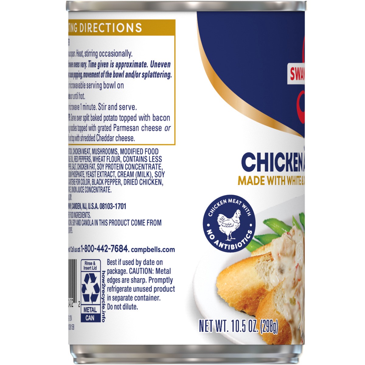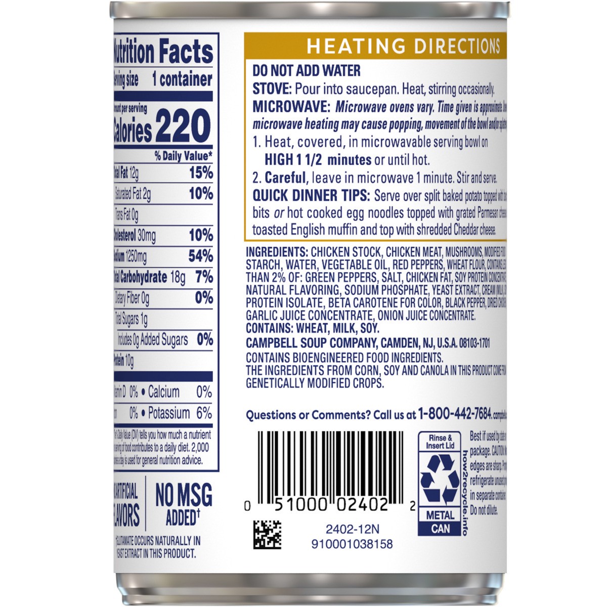 INGREDIENTS: CHICKEN STOCK, CHICKEN MEAT, MUSHROOMS, MODIFIED FOOD STARCH, WATER, VEGETABLE OIL, RED PEPPERS, WHEAT FLOUR, CONTAINS LESS THAN 2% OF: GREEN PEPPERS, SALT, CHICKEN FAT, SOY PROTEIN CONCE…