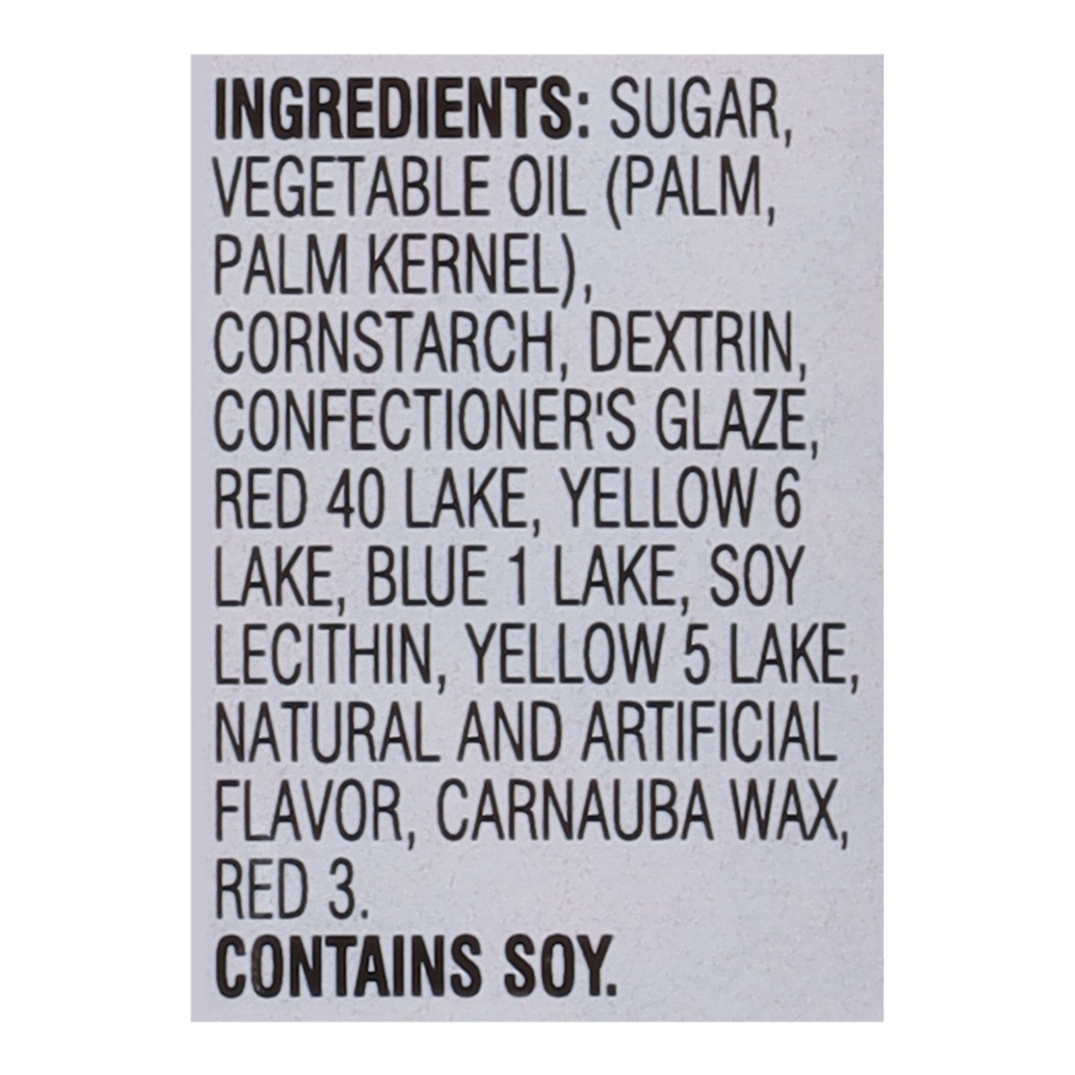 Sugar, Vegetable Oil (Palm, Palm Kernel), Cornstarch, Dextrin, Confectioner's Glaze, Red 40 Lake, Yellow 6 Lake, Blue 1 Lake, Soy Lecithin, Yellow 5 Lake, Natural and Artificial Flavor, Carnauba Wax, …