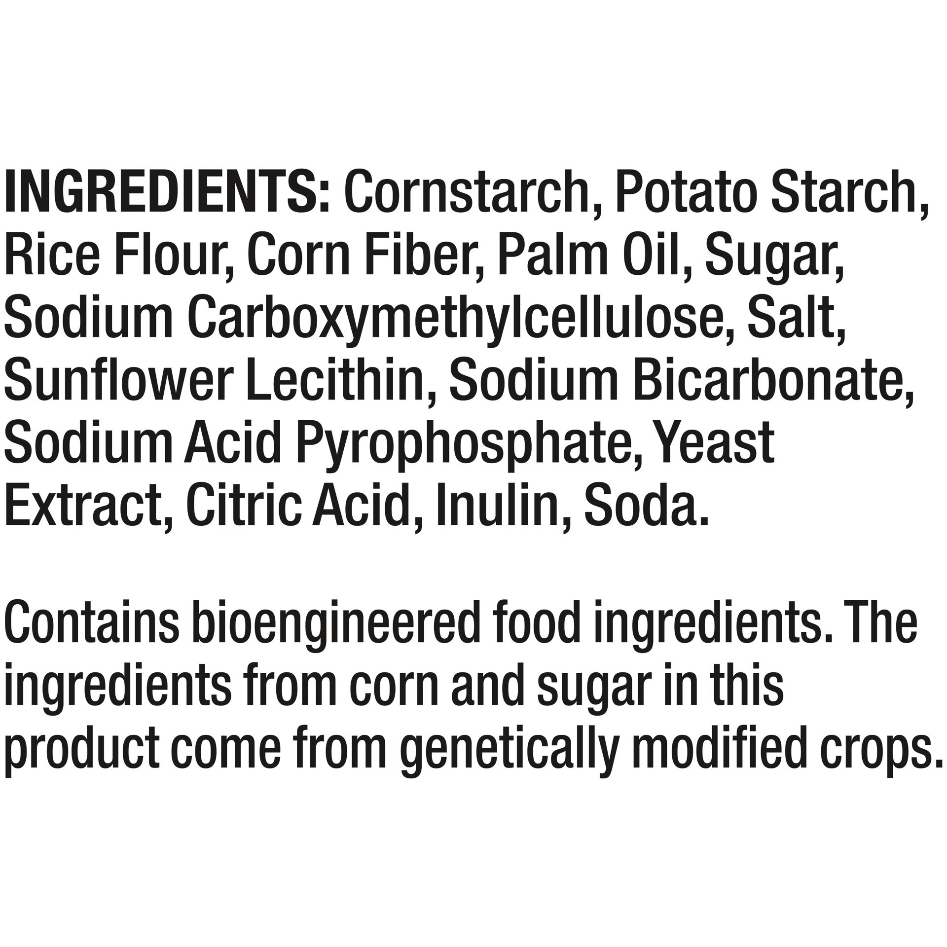 INGREDIENTS: CORNSTARCH, POTATO STARCH, RICE FLOUR, CORN FIBER, PALM OIL, SUGAR, SODIUM CARBOXYMETHYLCELLULOSE, SALT, SUNFLOWER LECITHIN, SODIUM BICARBONATE, SODIUM ACID PYROPHOSPHATE, YEAST EXTRACT, …
