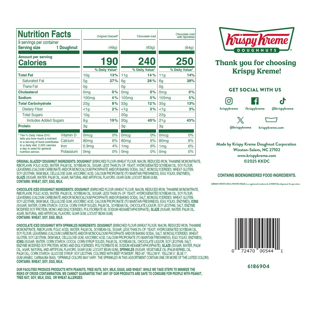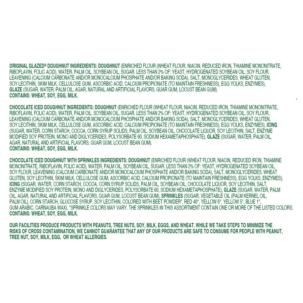 Chocolate iced glazed w/ sprinkles: contains: wheat, soy, egg, milk. our facilities produce products with peanuts, tree nuts, soy, milk, eggs, and wheat. while we take steps to minimize the risks of cross contamination, we cannot guarantee that any of our products are safe to consume for people with peanut, tree nut, soy, milk, egg, or wheat allergies. original glazed: contains: wheat, soy, egg, milk. our facilities produce products with peanuts, tree nuts, soy, milk, eggs, and wheat. while we take steps to minimize the risks of cross contamination, we cannot guarantee that any of our products are safe to consume for people with peanut, tree nut, soy, milk, egg, or wheat allergies.