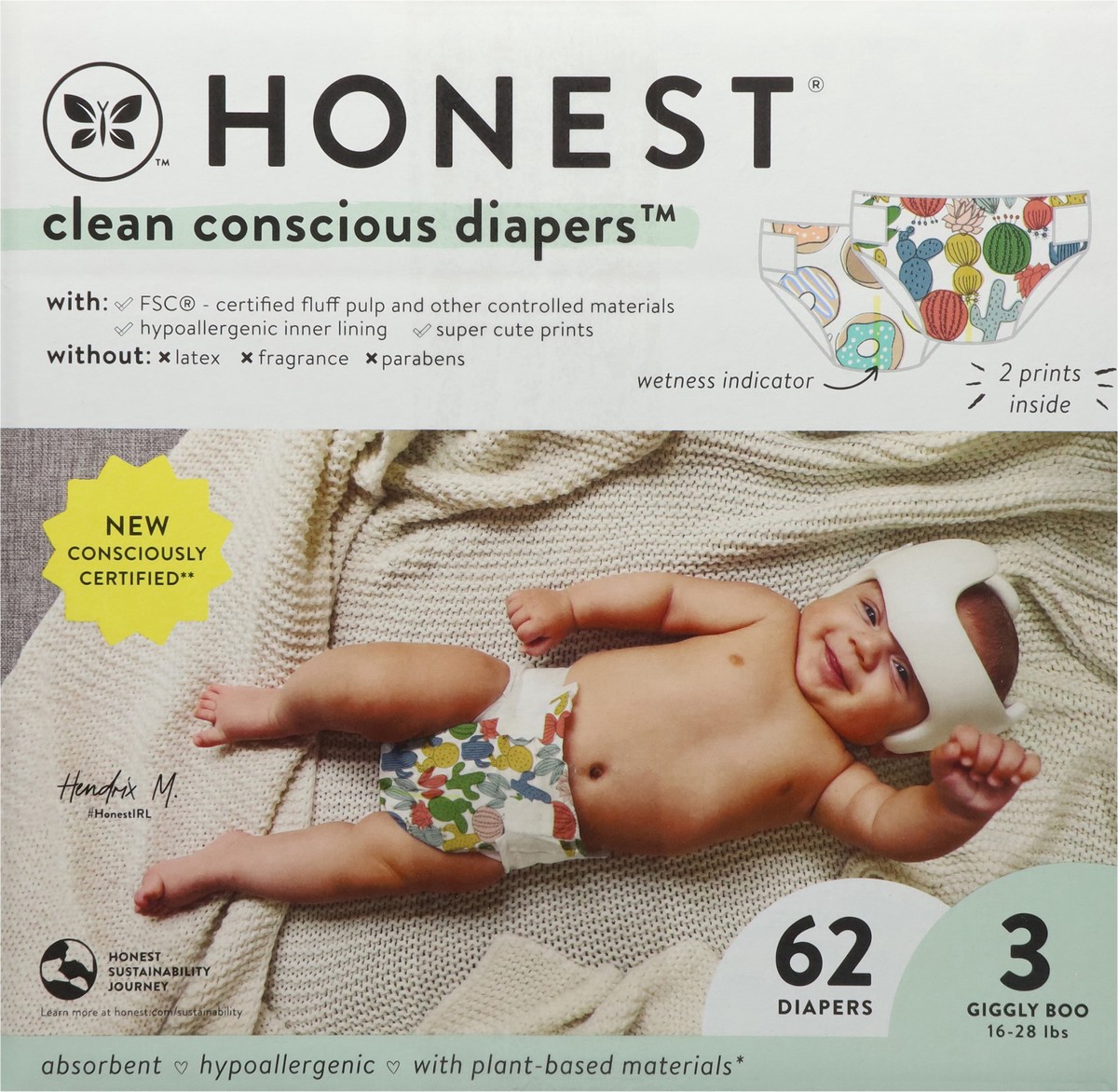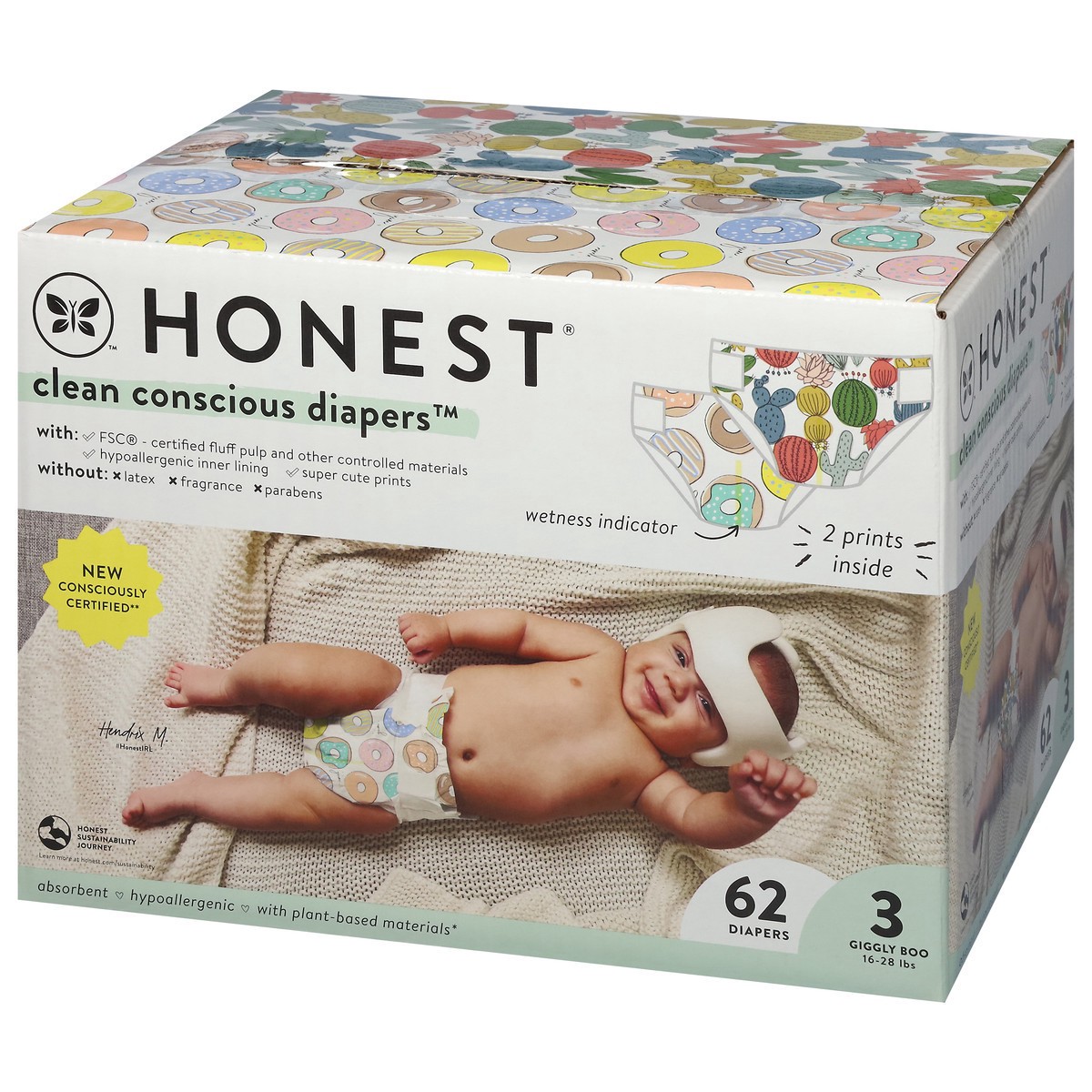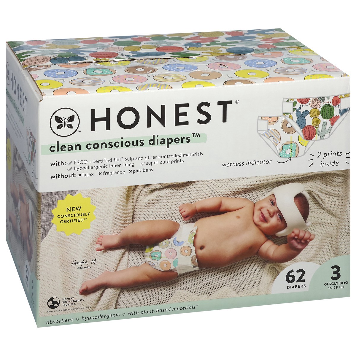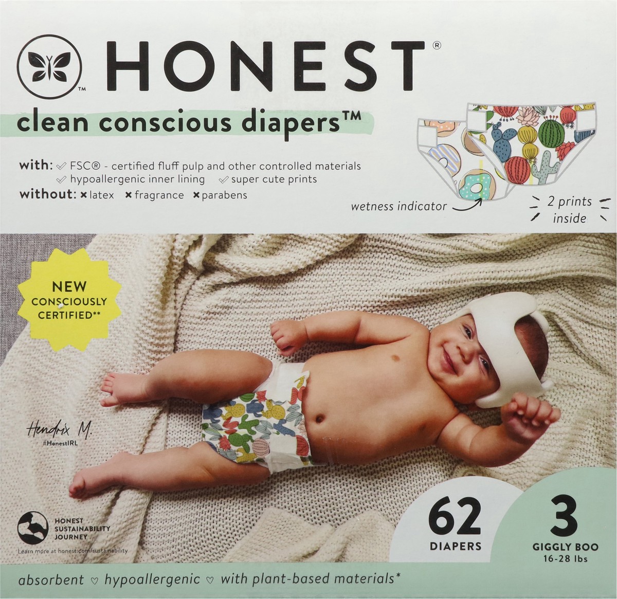 Honest Clean Conscious Diapers! Designed around skin wellness. Great fit, wetness indicator, stretchy side panels, fast absorbing using plant based core, new fashion inspired print strategy aligned wi…