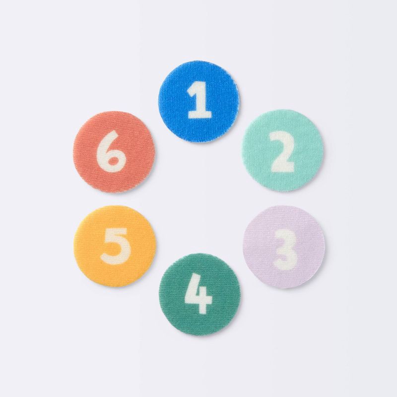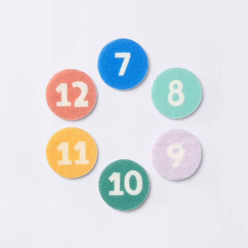 - 6 circular multicolor plaques marked with numbers 1 through 12